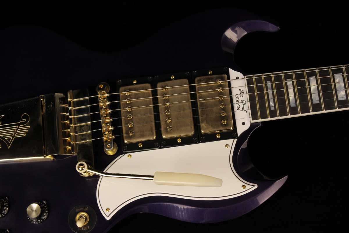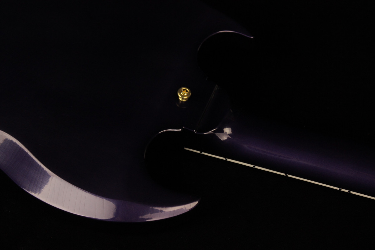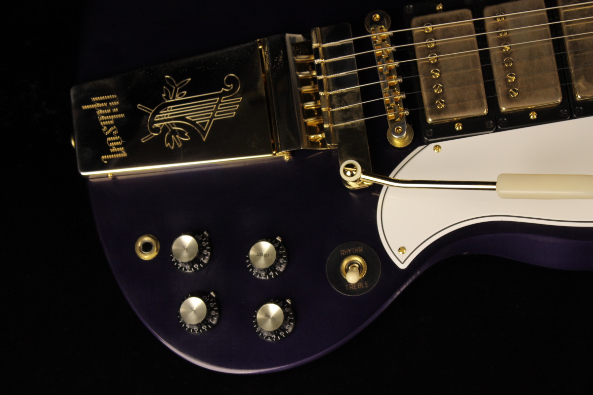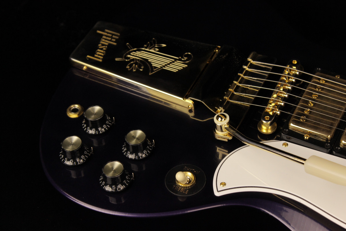 This is the case of the Gibson Custom Murphy Lab 1963 Les Paul SG Custom Reissue with Maestro Vibrola M2M Ultra Light Aged: from the first glance the combination of the Purple finish with Murphy Lab treatment and the gold hardware is striking.