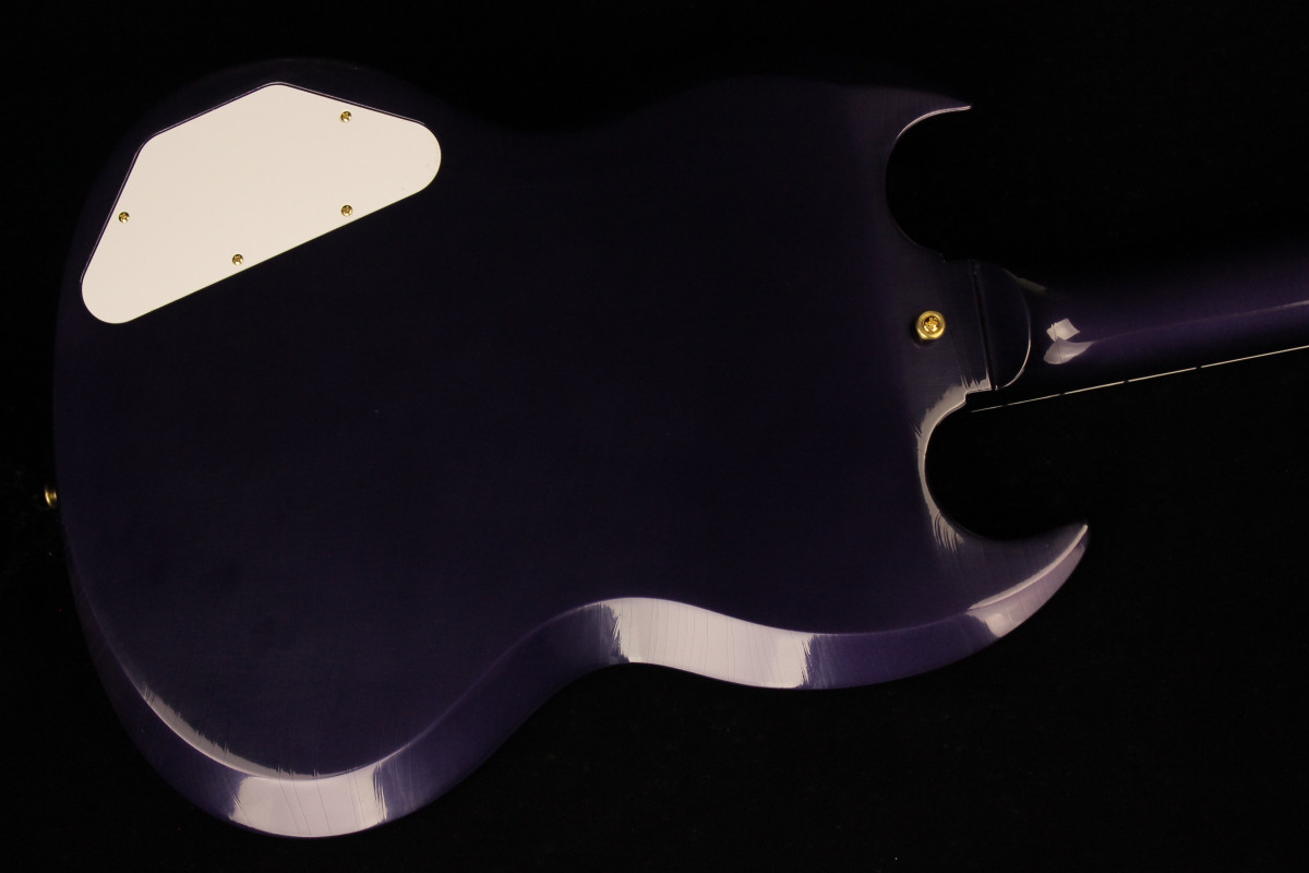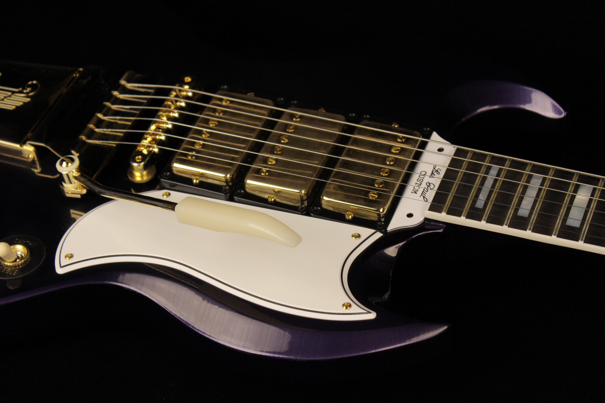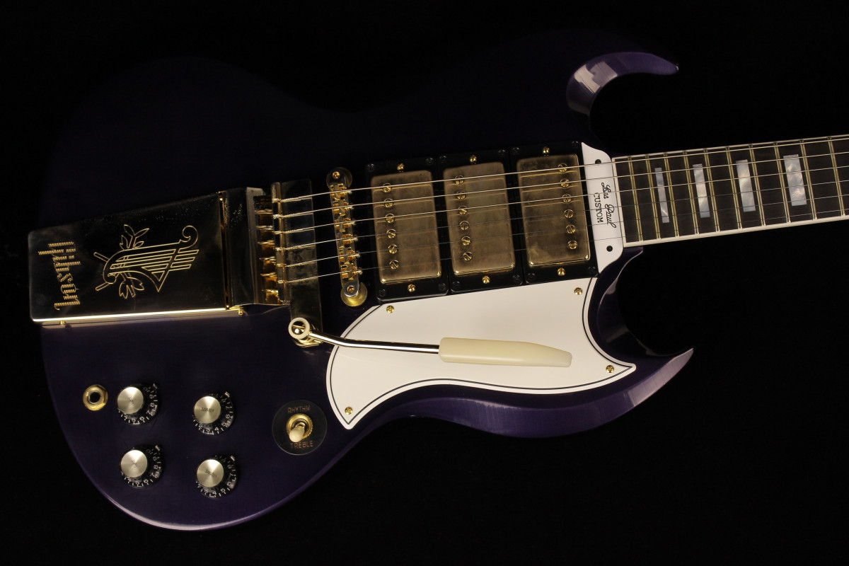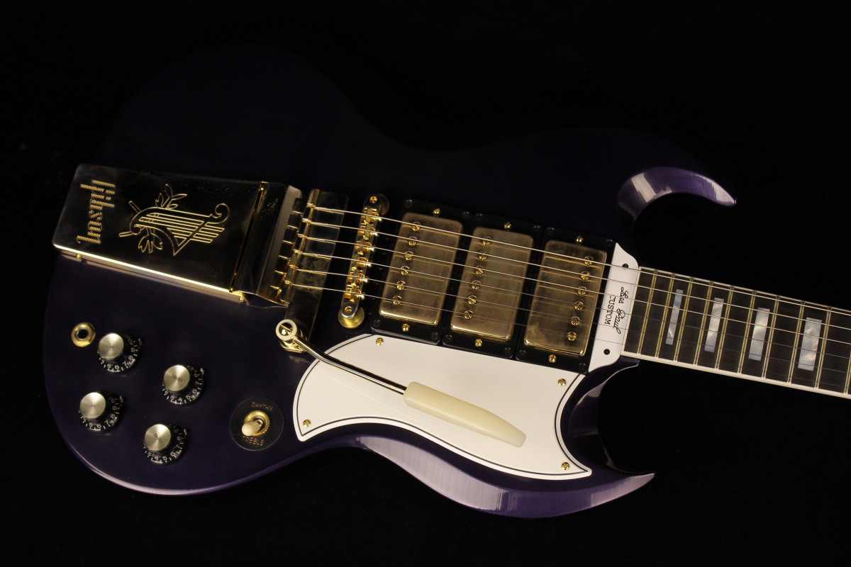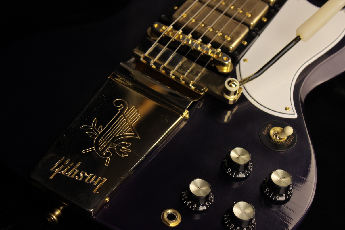 This is the case of the Gibson Custom Murphy Lab 1963 Les Paul SG Custom Reissue with Maestro Vibrola M2M Ultra Light Aged: from the first glance the combination of the Purple finish with Murphy Lab treatment and the gold hardware is striking.