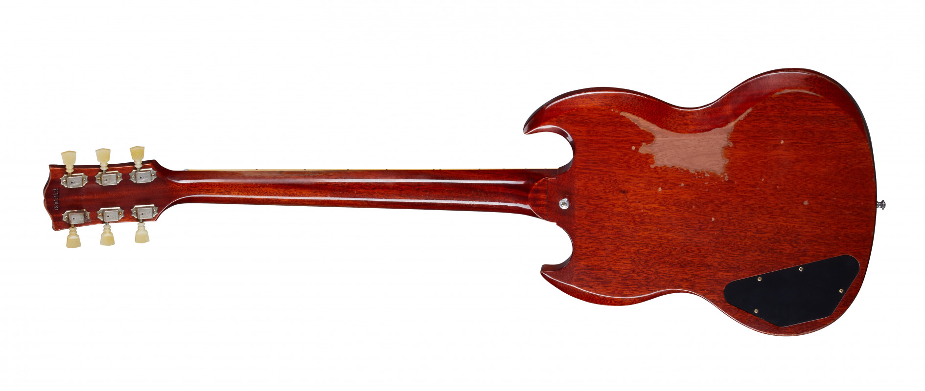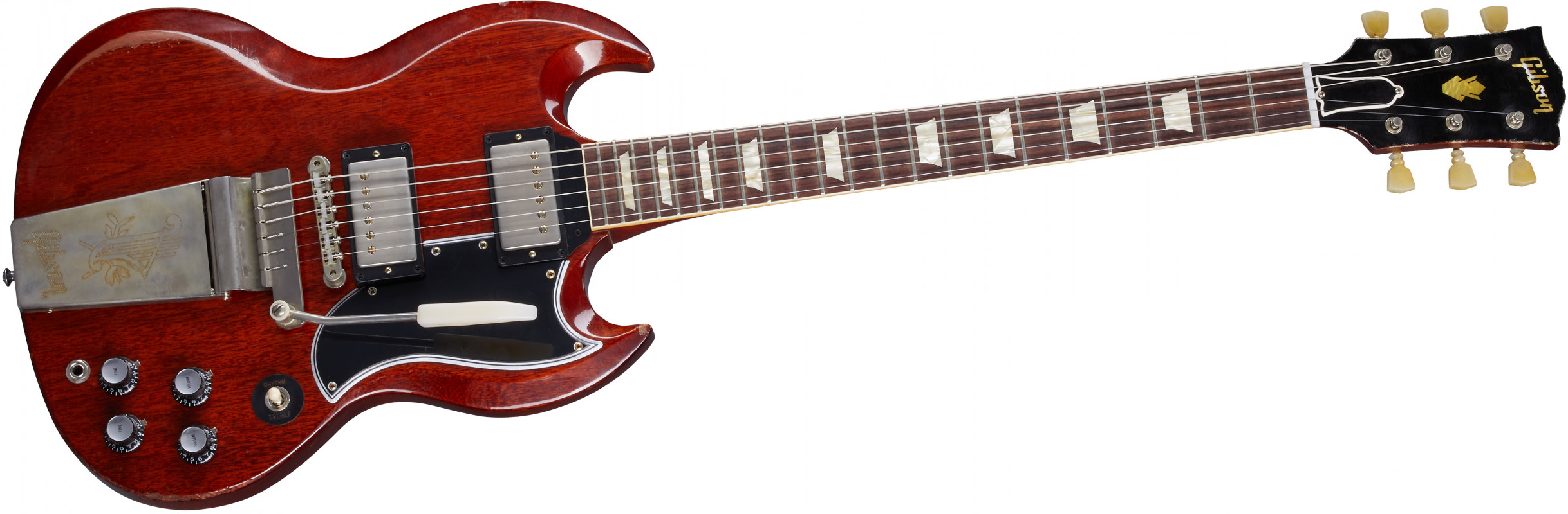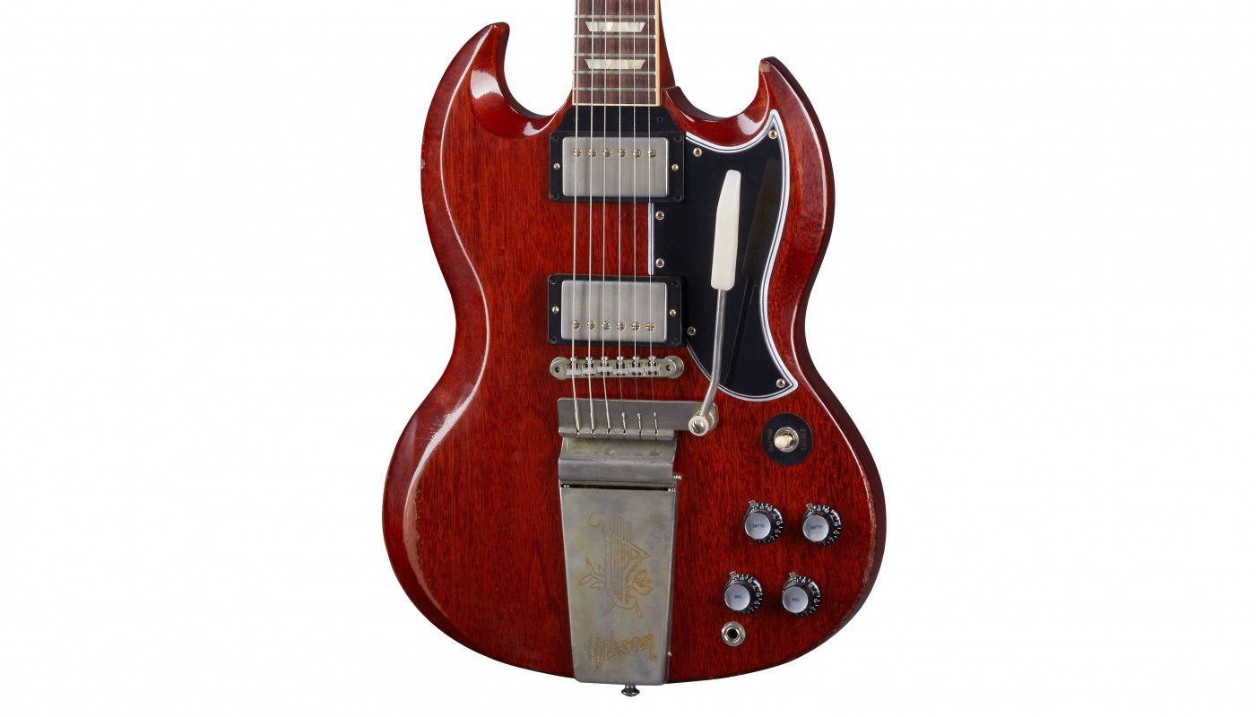 In particular, this Gibson Custom Murphy Lab 1964 SG Standard Reissue w/Maestro Vibrola Heavy Aged faithfully reproduces the SG Standard from 1964, the year the Maestro™ Vibrola was introduced.