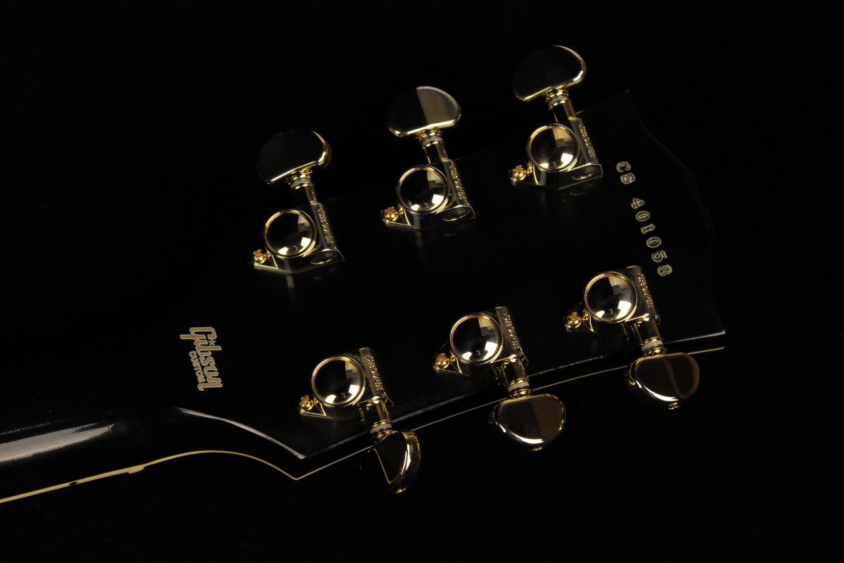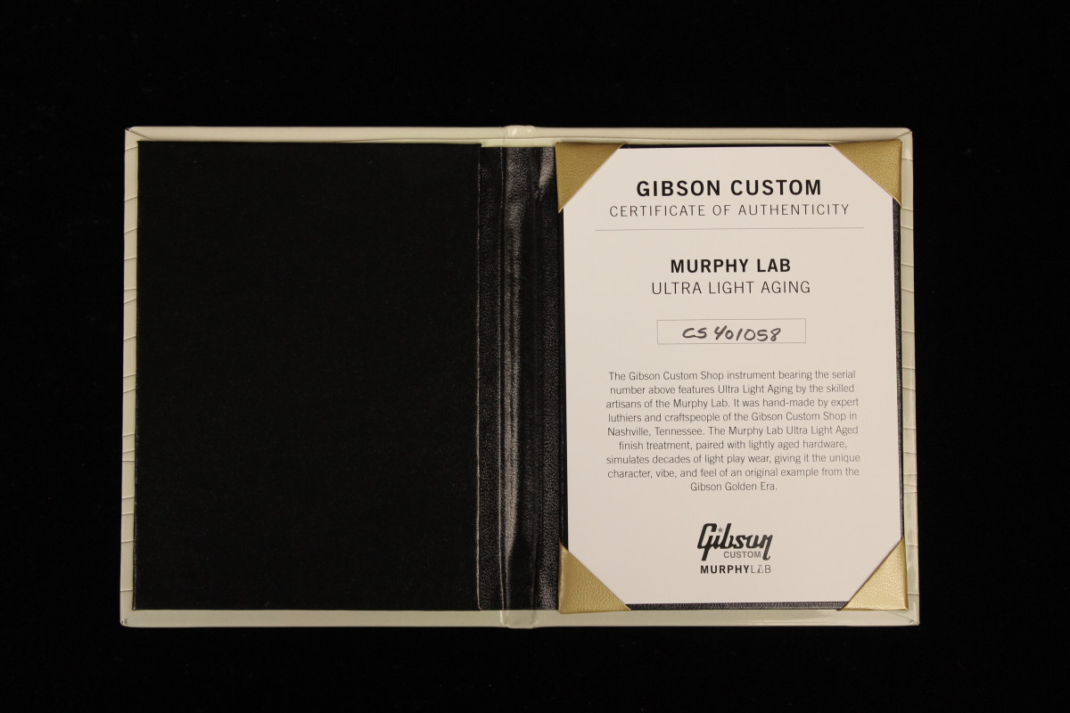 This specific guitar was ordered as Custom Order through the Gibson Custom Shop Made 2 Measure program and features a Murphy Lab Ultra Light Aged finish, Custombucker Unpotted humbuckers with exposed coils, Gold Hardware and an elegant Ebony finish.