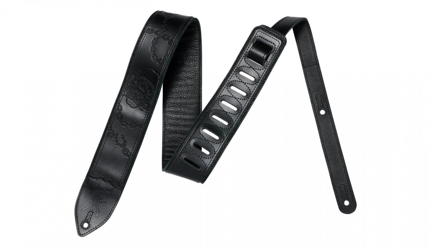 A tribute to one of the greatest guitar heroes in history, the Gibson Dave Mustaine Signature Leather Guitar Strap is a high-quality leather strap designed for comfort, featuring artwork by Vic Rattlehead.