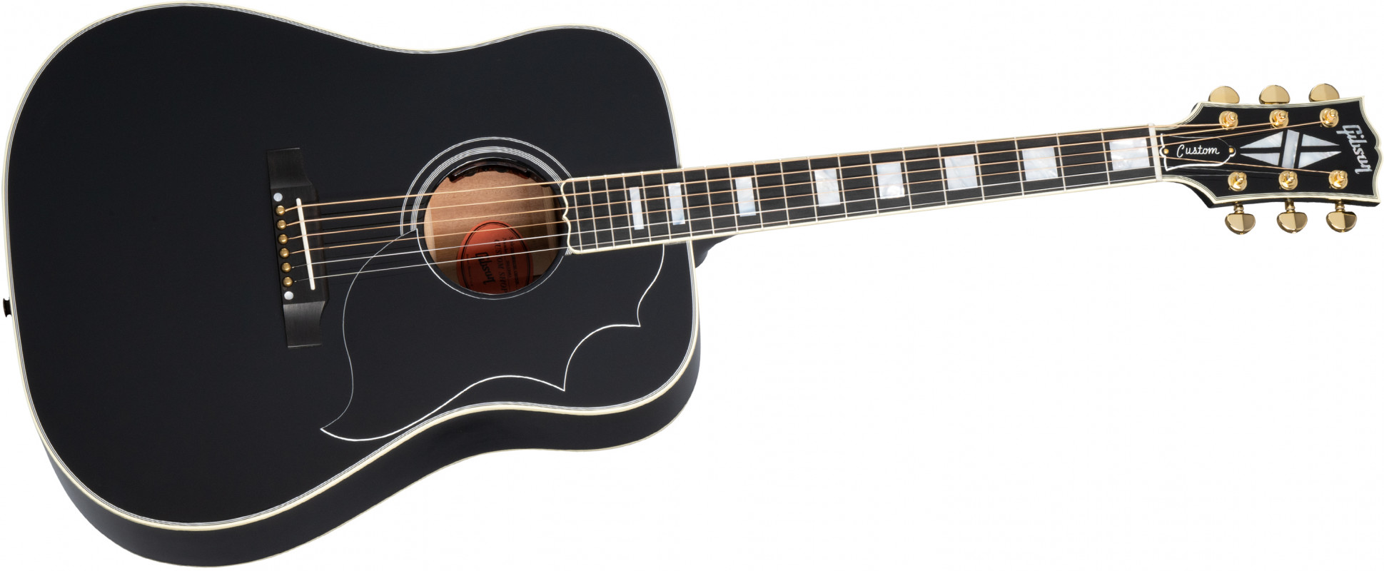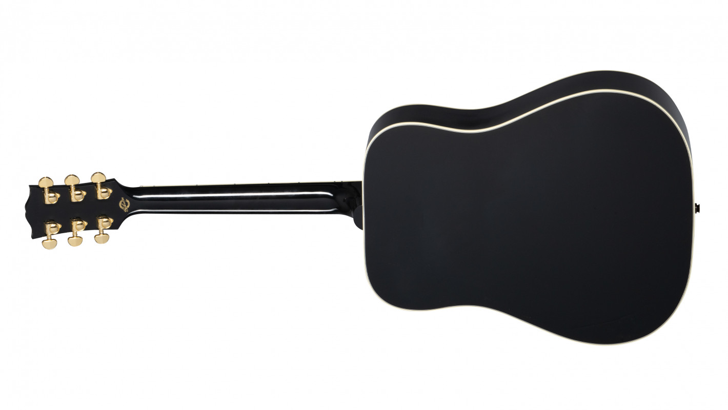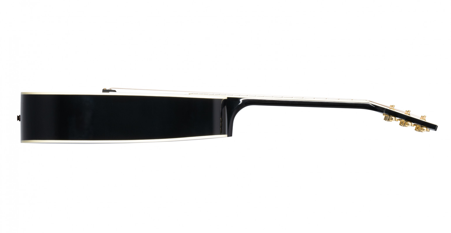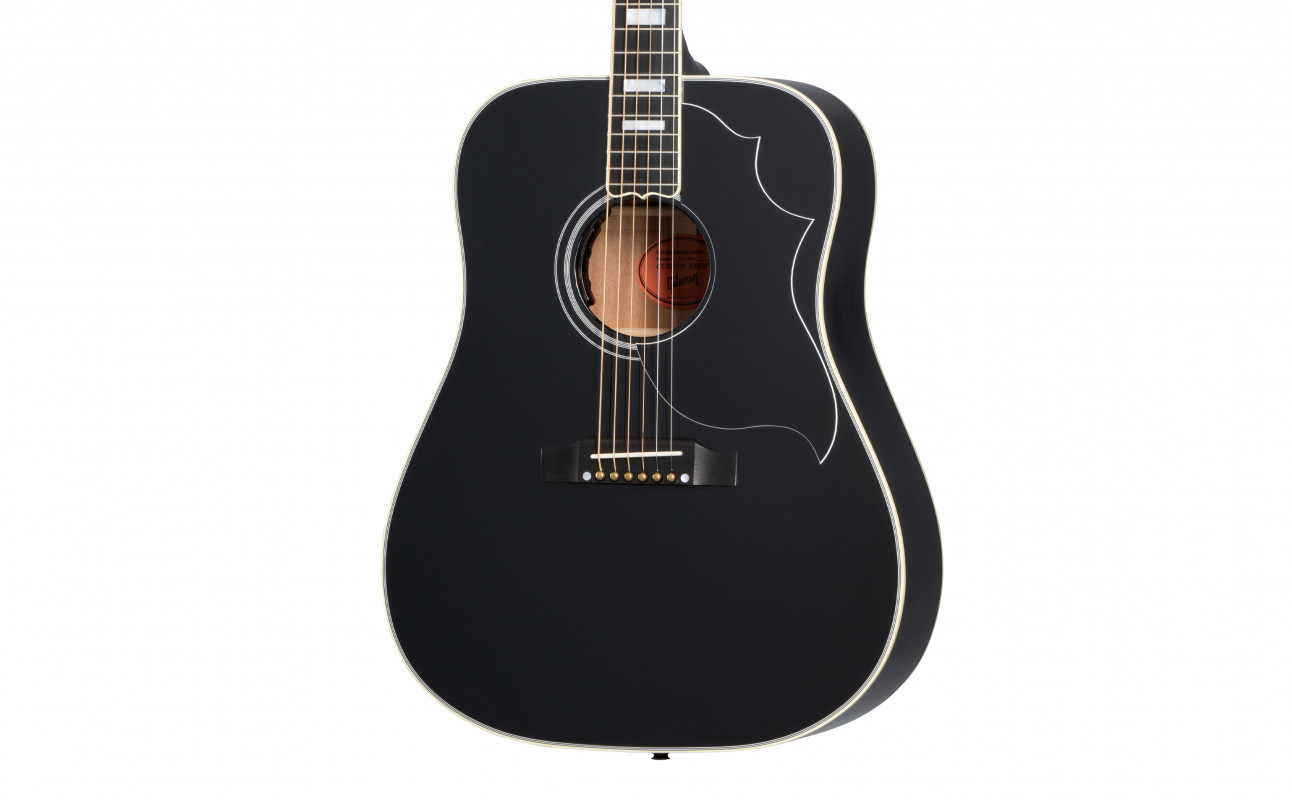 It builds on the classic Hummingbird features that players expect, including a Sitka spruce top, mahogany back and sides, and a 24.75” scale mahogany neck with a round profile, and adds Les Paul™ Custom-inspired cosmetics, including an Ebony nitrocellulose lacquer finish, multi-ply binding on the top and back, a Les Paul-style peghead with a Custom split diamond inlay in mother of pearl, a bound ebony fretboard with mother of pearl Custom Block inlays, and gold Grover® Rotomatic® tuners. It comes equipped with L.R. Baggs™ Session VTC electronics and a hardshell case.