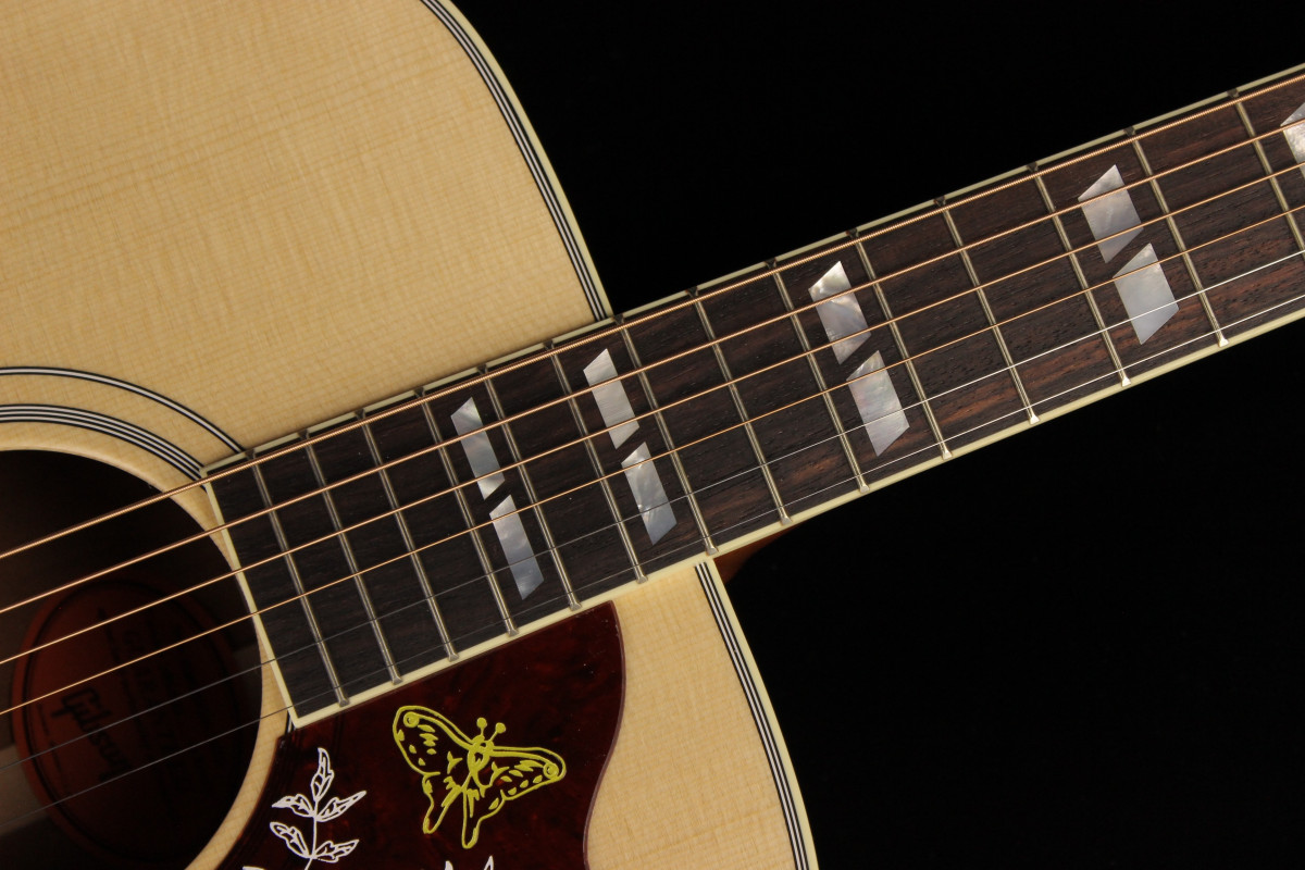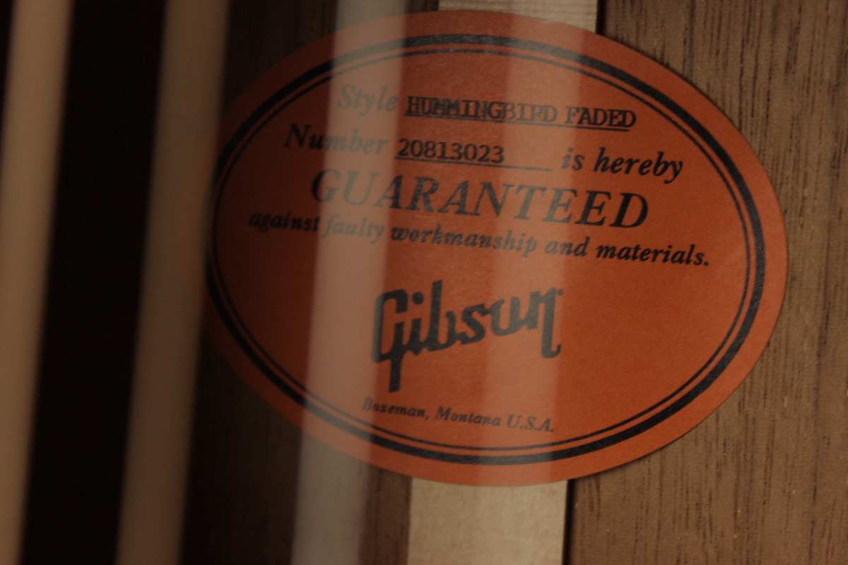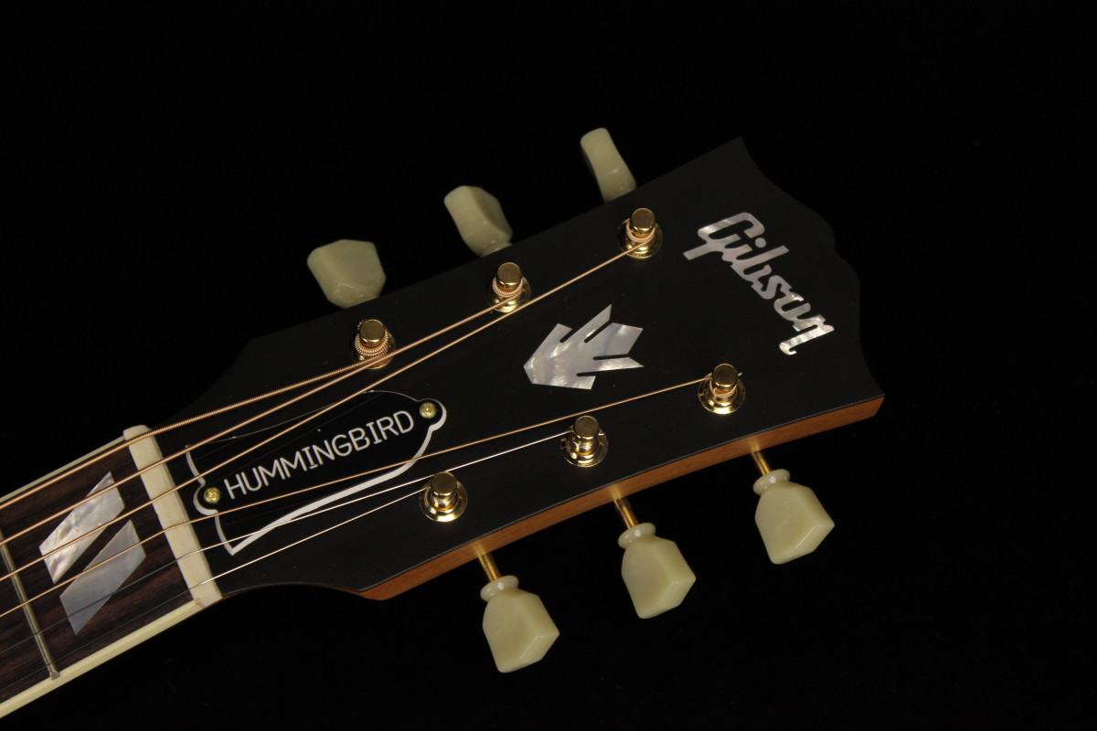 The Hummingbird Faded is outfitted with gold Gotoh® Keystone tuners, a traditional Hummingbird truss rod cover, and a bone nut and saddle.