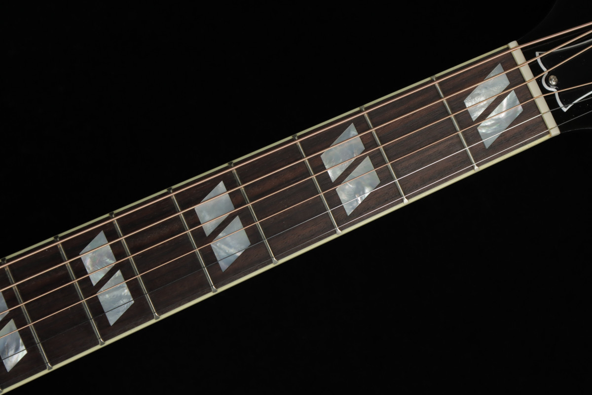 This instrument features a Dreadnought Square Shoulder body shape, with a solid Sitka spruce top and solid mahogany back and sides. The electronics include the excellent L.R. Baggs VTC active system, with volume and tone controls located within the soundhole.