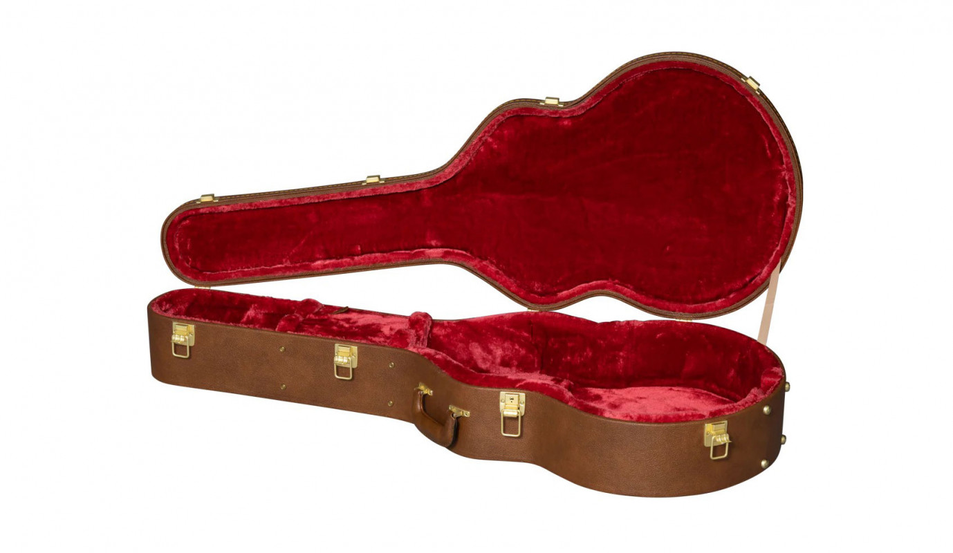 The Gibson J-185 Original Hardshell Case is the original Gibson USA case for the J-185. Externally, it features a brown covering with a gold Gibson logo. The interior is lined with red plush.