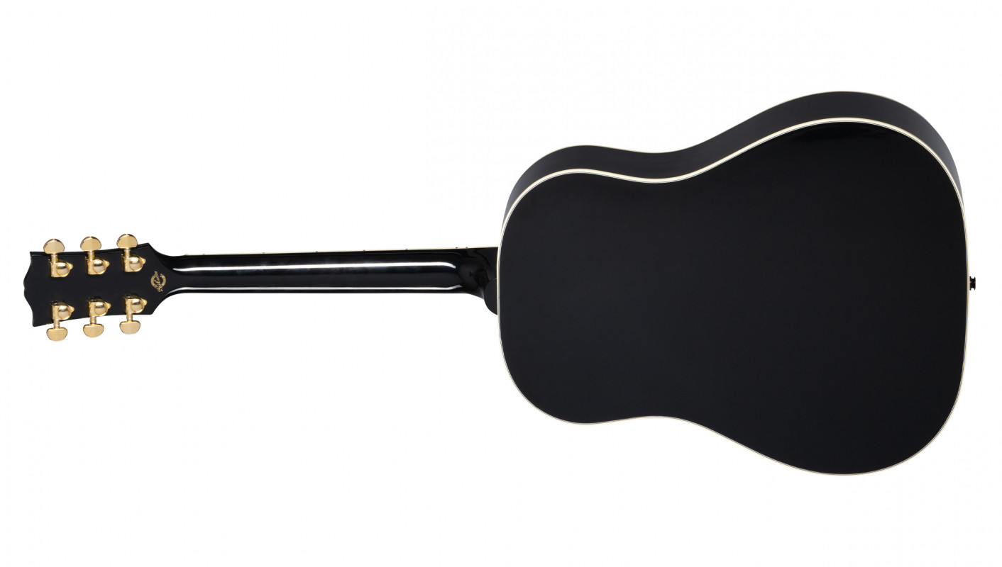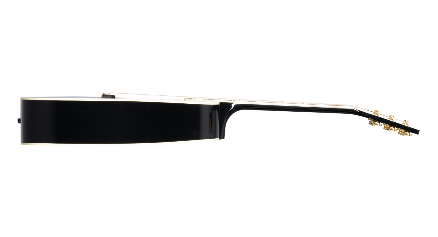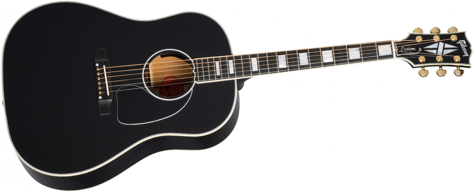 The J-45 Custom takes things to the next level with Les Paul™ Custom-inspired cosmetics, including an Ebony nitrocellulose lacquer finish, multi-ply binding on the top and back, a bound Les Paul-style peghead with a Custom split diamond inlay in mother of pearl, a bound ebony fretboard with mother of pearl Custom Block inlays, and gold Grover® Rotomatic® tuners. It comes equipped with L.R. Baggs™ Session VTC electronics and a hardshell case.