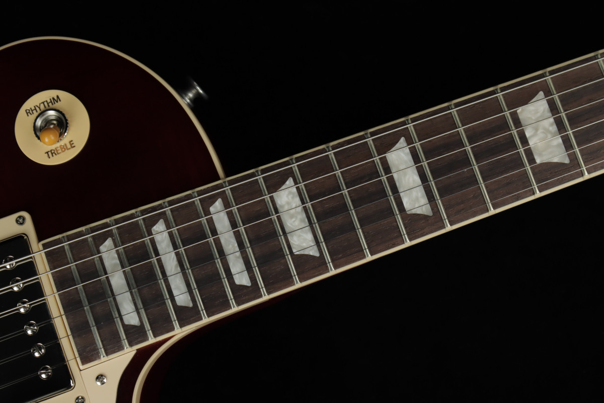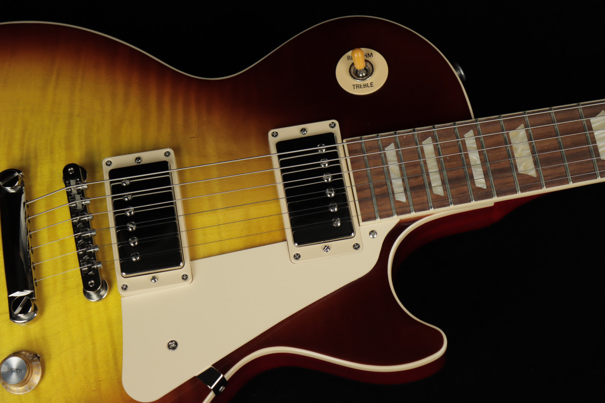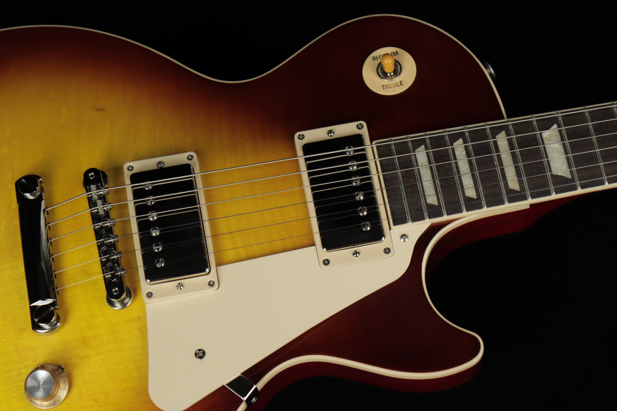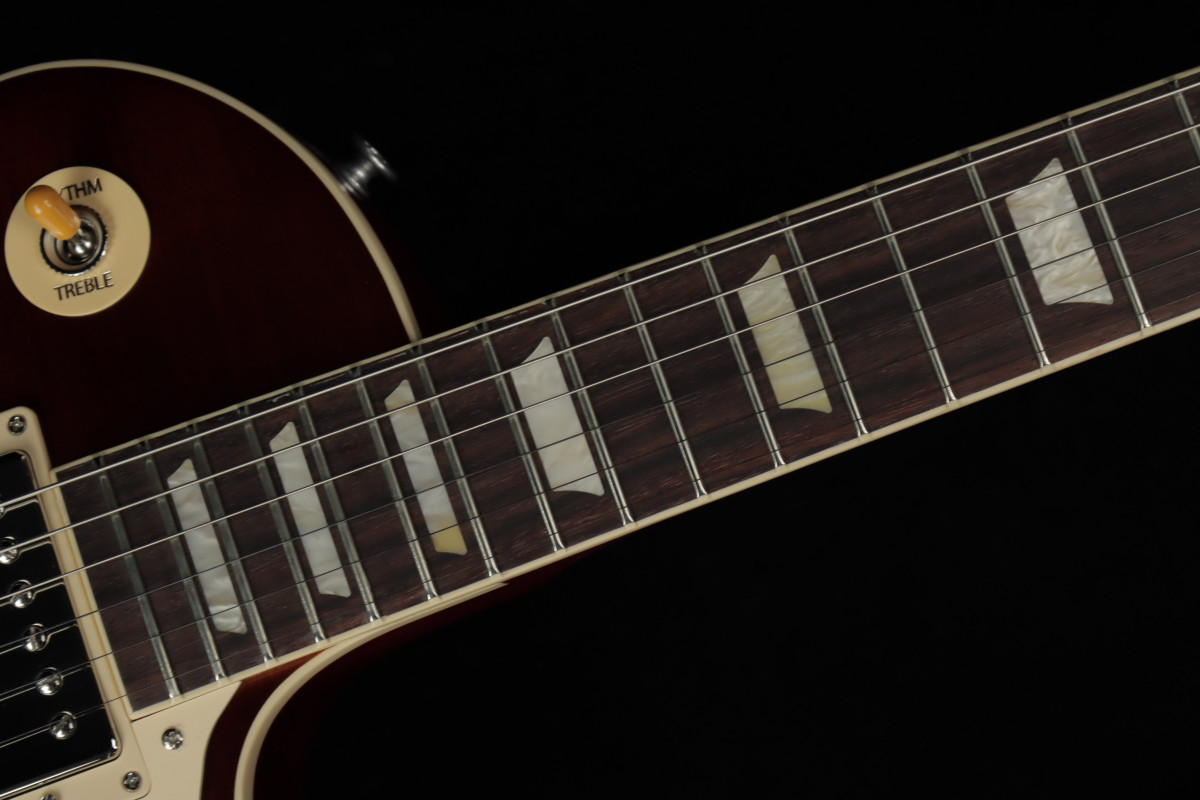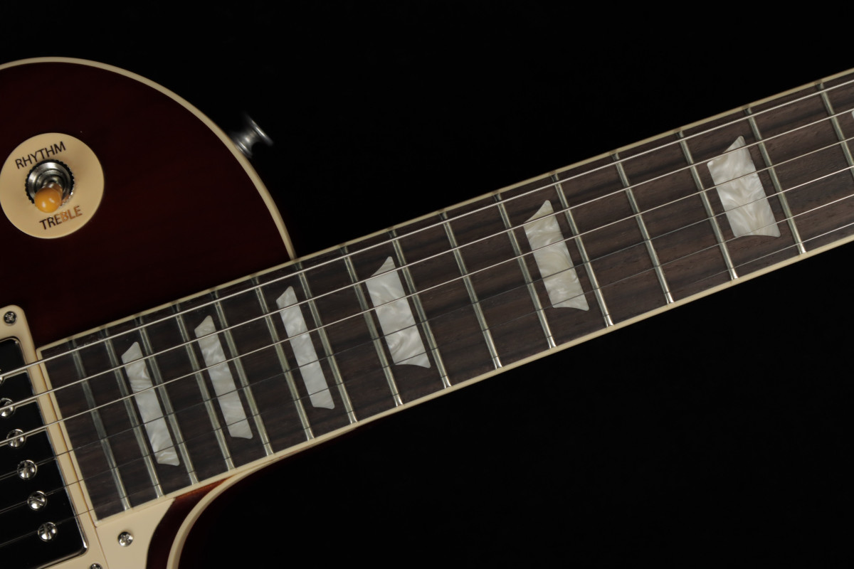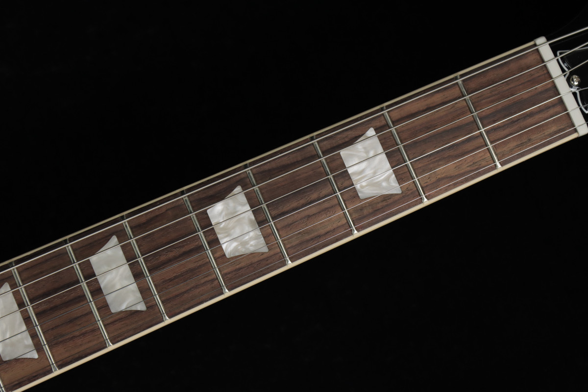 The fingerboard, made of rosewood, is adorned with "Trapezoid" inlays, while the bridge is a classic ABR-1 Tune-o-matic.