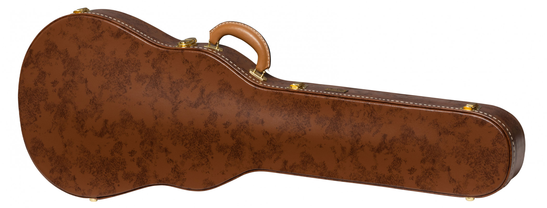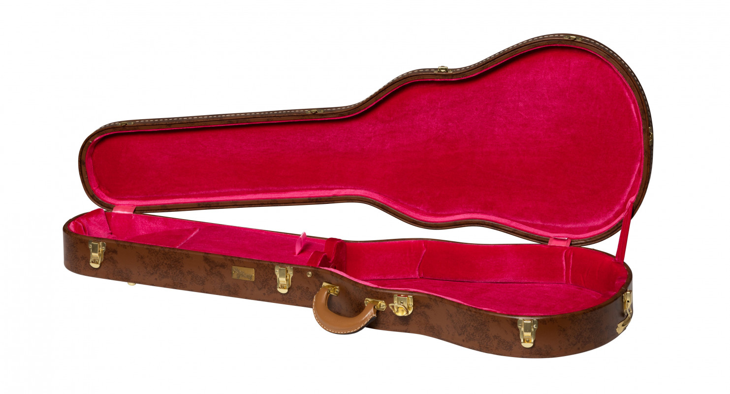 Designed to accommodate: 1950s Les Paul Standard (compatible with most Les Paul Standards and Les Paul Customs), exterior in brown tolex with a mottled finish, interior in pink plush, historical C-shaped neck support, historically styled hinges with a lock, accessory compartment with a ribbon tab.