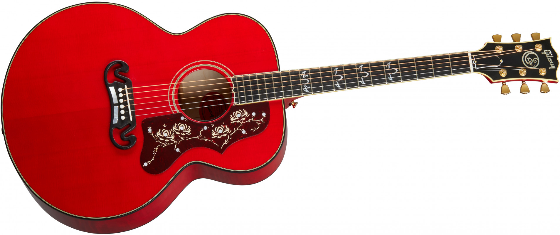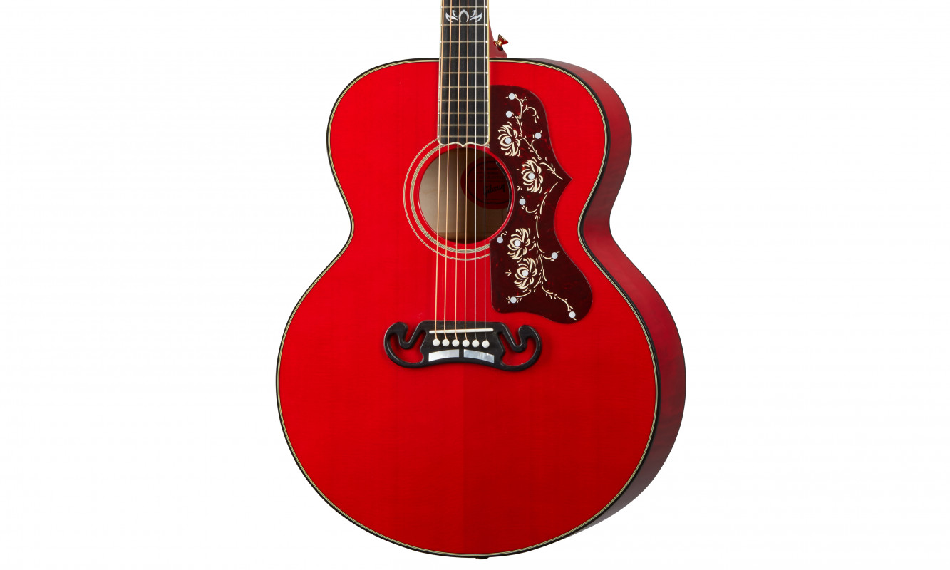 This is a SJ-200 characterized by a AAA Sitka spruce top, flamed maple back and sides, and a neck borrowed from the ES-345 model. Thus, it is a SJ-200 that differs from the traditional one! Other customizations requested by the artist include an ebony fingerboard, the "O" inlay on the headstock, Grover Keystone tuners, and a stunning Cherry finish.