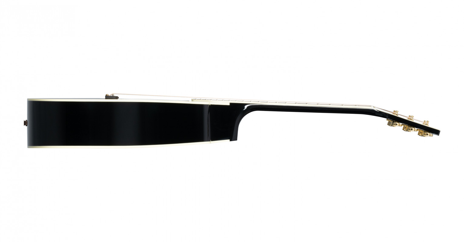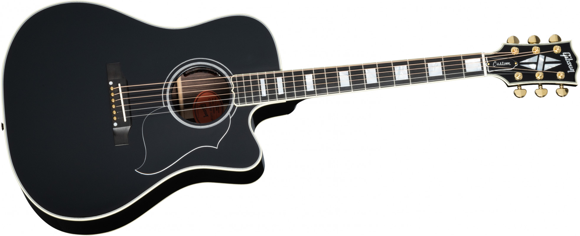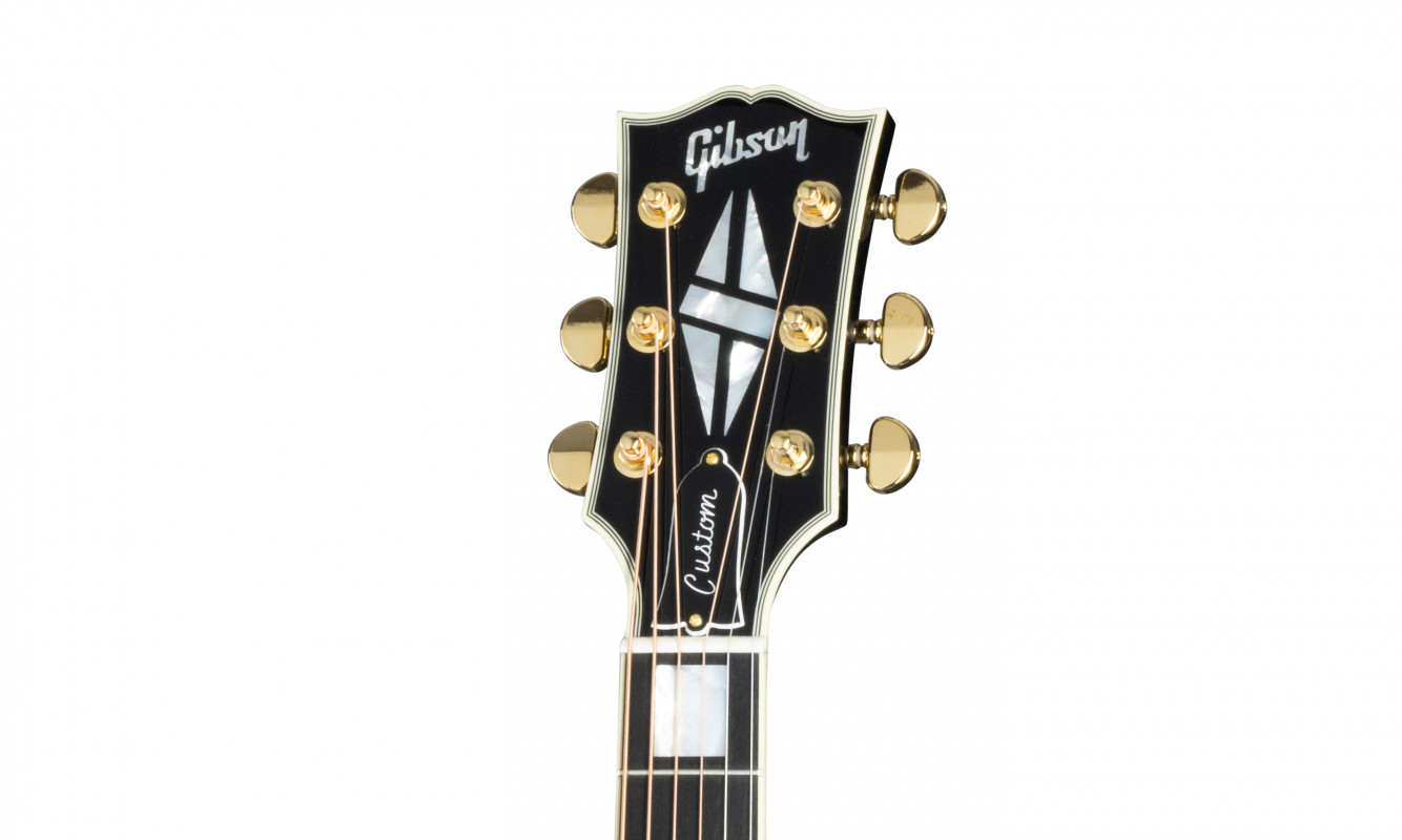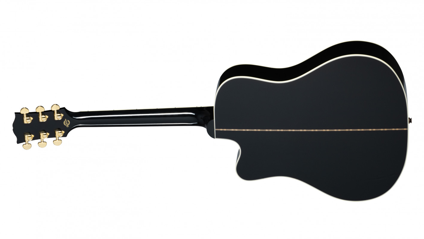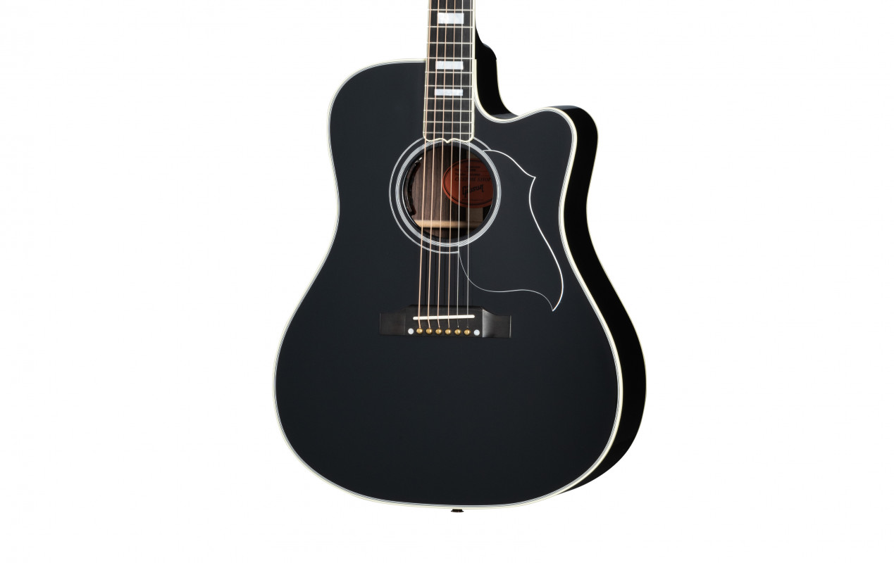 The cutaway body design ensures excellent access to the higher frets on the comfortable rounded profile neck with an ebony fingerboard. This version of the Songwriter undergoes a Custom treatment with aesthetic details inspired by the Les Paul™ Custom, including a "Ebony" nitrocellulose lacquer finish, "multi-ply" binding on the top and back, a Les Paul-style headstock featuring a Custom broken diamond inlay in mother-of-pearl, an ebony fingerboard with binding and "Custom Block" inlays in mother-of-pearl, and Grover® Gold Rotomatic® tuners.