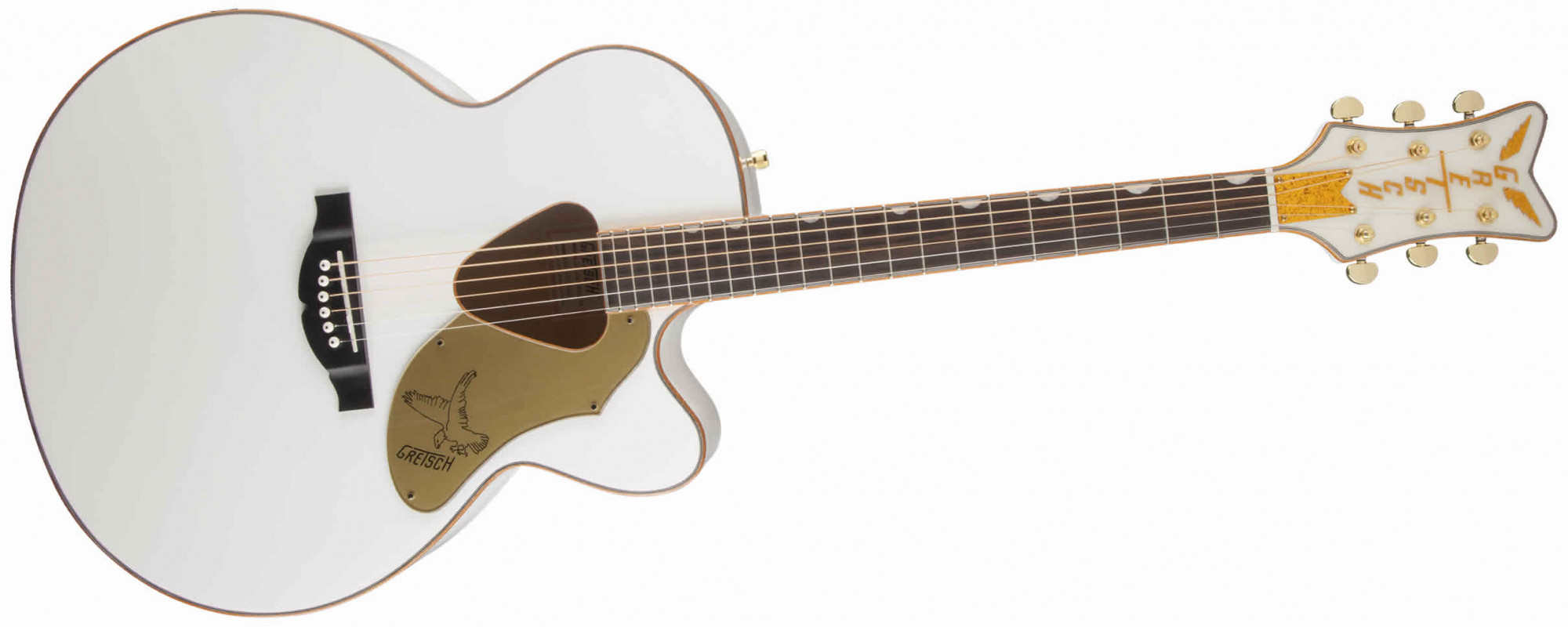 The Gretsch G5022CWFE Rancher™ Falcon is a Jumbo acoustic guitar that delivers fantastic sound and an open tone, thanks to the high-quality materials used: the top is made of solid spruce, while the back and sides are crafted from laminated maple. The mahogany neck is paired with a 21-fret rosewood fingerboard, enhancing the legendary White Falcon design aesthetically.