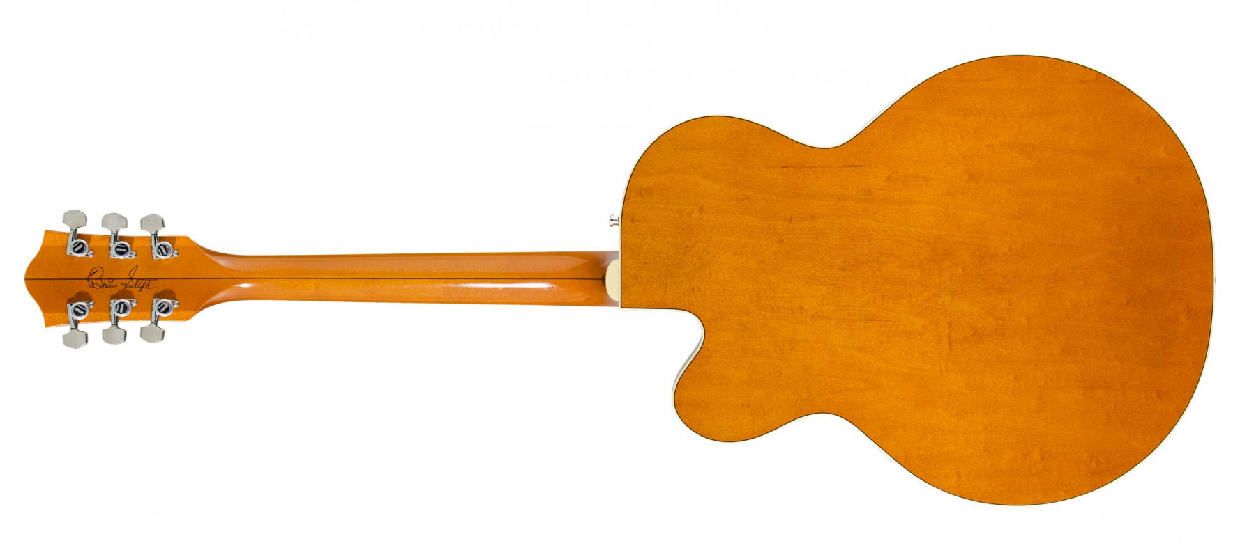 Specifically, it boasts a laminated maple body with "1959 Trestle Bracing," oversized F-holes, a maple neck with a "V" profile, an ebony fingerboard with a compound radius of 9.5" - 12", and rolled edges for exceptional comfort.