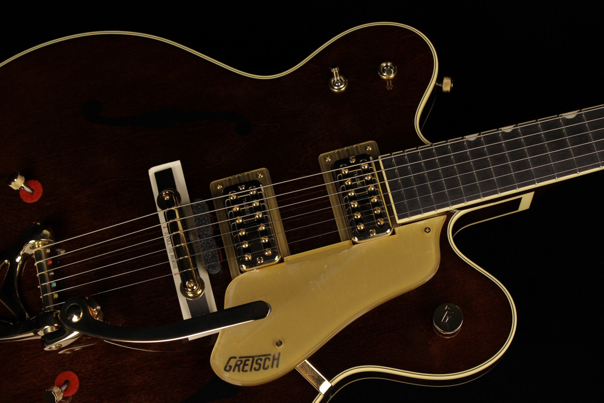 A true rock ‘n’ roll classic, this guitar features the appointments that made this guitar a legend—dual foam string mutes with red felt surrounds, standby switch, laminated 3-ply maple top with simulated F-holes, gold “G Arrow” control knobs, aged white binding with black purfling, gloss urethane finish, aged pearloid thumbnail inlays, gold vintage thick plexi pickguard with Gretsch logo and gold Grover® Imperial™ tuning machines. A distinguished instrument from the earliest days of the British Invasion, the G6122T-62 Vintage Select Edition '62 Chet Atkins® Country Gentleman® Hollow Body with Bigsby® is the guitar that laid down the foundation of rock as we know it.