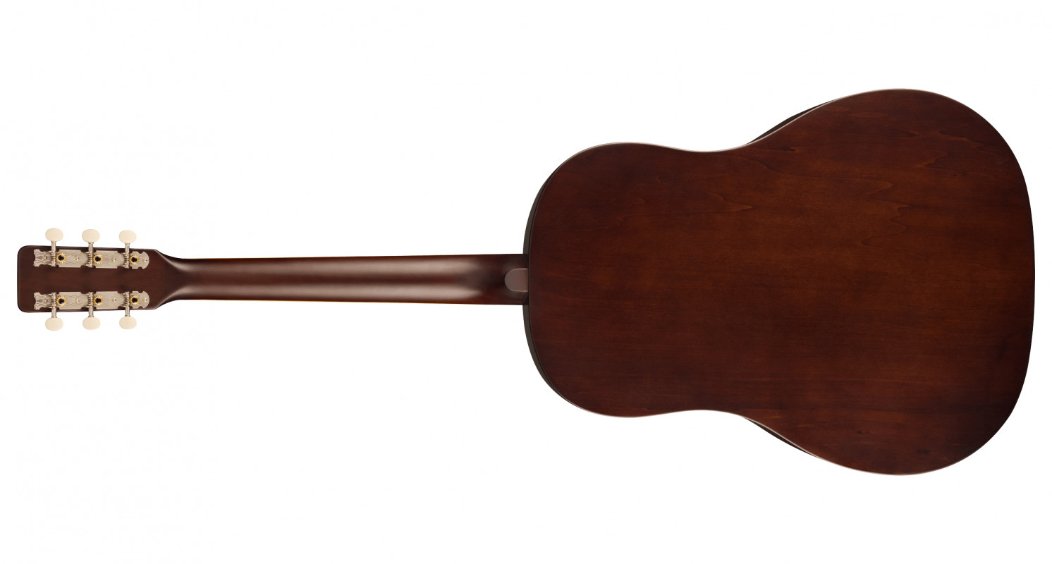 The X-braced top is crafted from lightweight laminate, achieving an optimal balance between warm tone and reliability. The "C"-shaped neck offers a comfortable feel with a retro touch. Vintage details, such as the period-style fixed bridge, the "G" graphic pickguard, the pinstripe-painted sides, vintage Open Gear tuners, and the "oversize" inlays on the fingerboard, give the guitar a true vintage vibe.