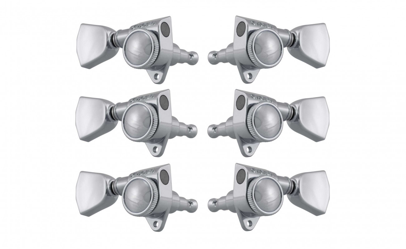 The Grover Roto-Grip Locking Rotomatics® feature an 18:1 gear ratio design and a string locking mechanism. To install the string, simply pass it through the through-hole of the shaft and secure the lock at the back of the tuner. Tuning stability is ensured, along with high ease of use. Mounting hardware is included.