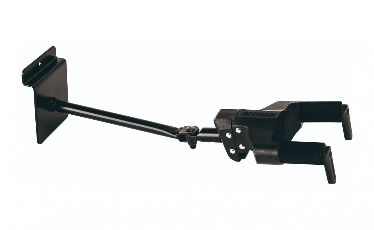 Universal Slatwall Guitar Wall Mount (16 mm). The safety arms close securely under the weight of the guitar.