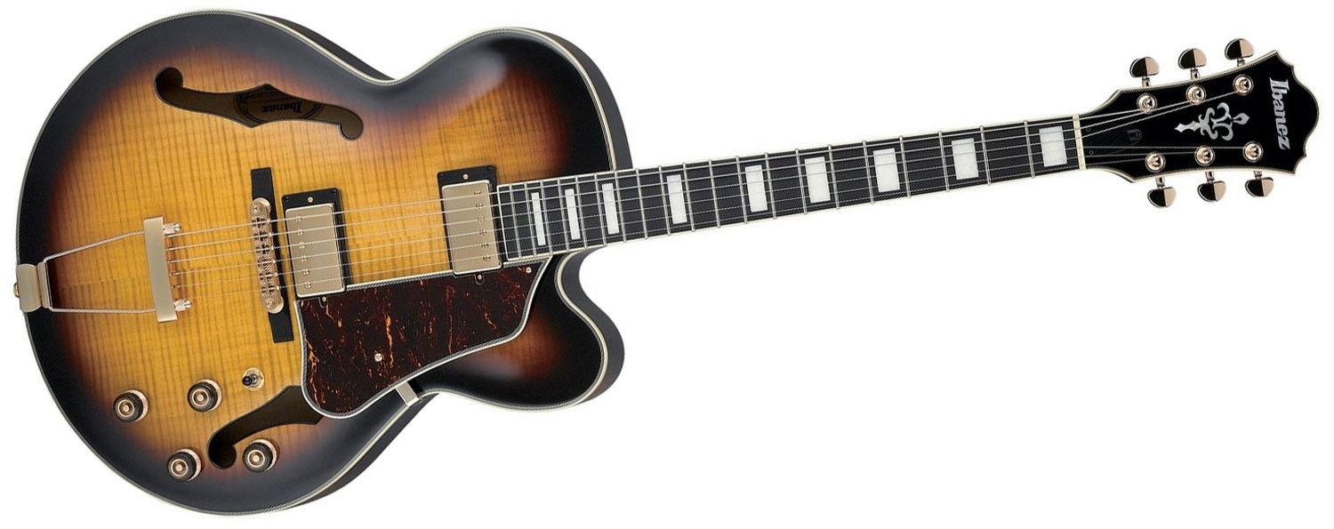 A guitar inspired by the giants of jazz, this instrument is designed for the most discerning guitarists. Crafted from selected materials, this Ibanez features a flamed maple body, a 3-piece neck made of mahogany and maple, and an ebony fingerboard.