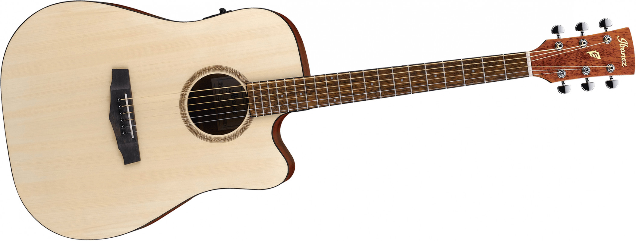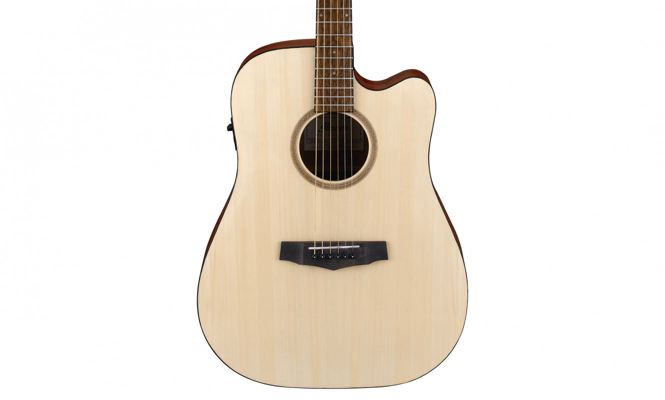 The Ibanez PF10CE is an amplified dreadnought acoustic guitar featuring a spruce top and Okoume back and sides, all finished in Open Pore. This entry-level instrument offers an excellent quality-to-price ratio, making it perfect for beginner guitarists.