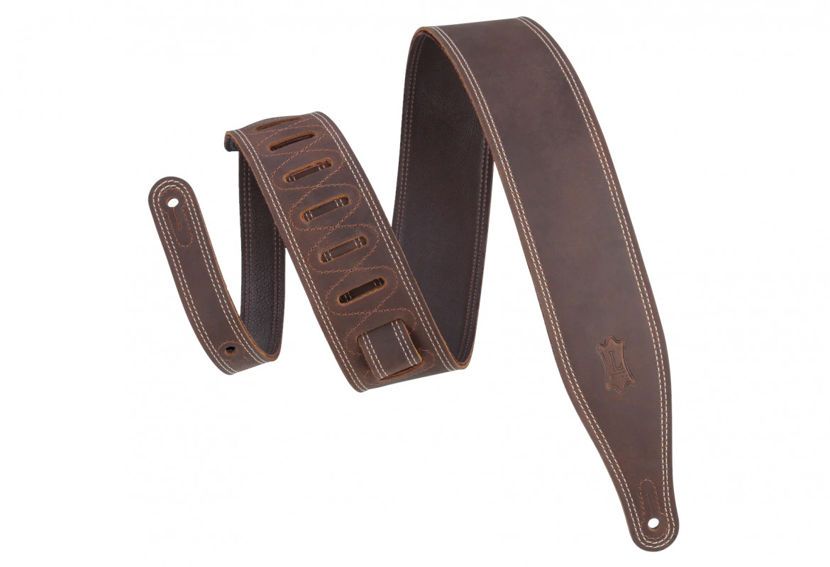 The Levy's M17BDS-BRN is crafted from soft, vintage-looking leather and can be adjusted from 41" (104.14 cm) to 55" (139.7 cm). It has a width of 2.5" (6.35 cm) and features double stitching along the edges, which prevents the strap from distorting under weight.