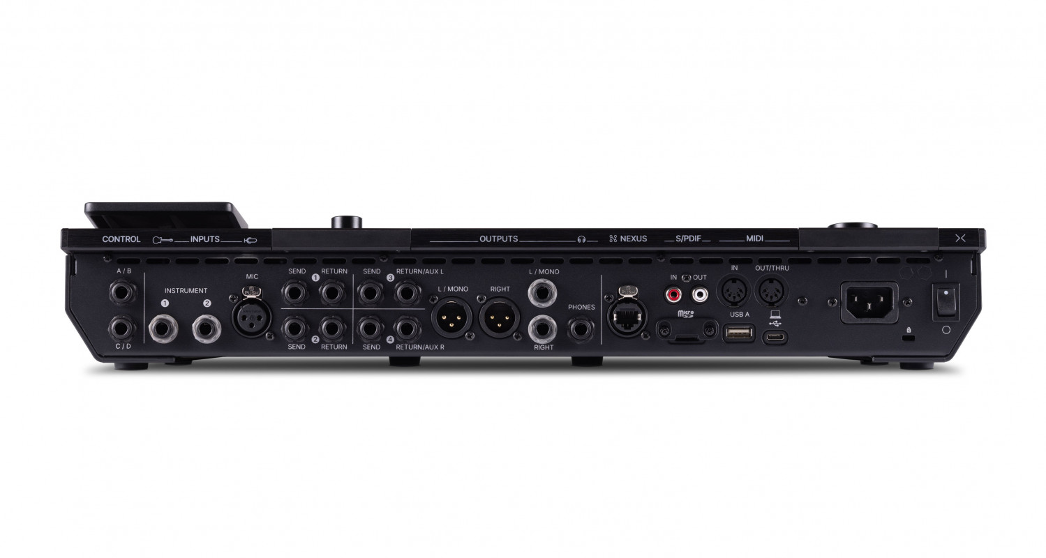 In terms of connectivity, the device includes: 2 instrument inputs with variable impedance, an XLR microphone preamp, 4 stereo effects loops, balanced XLR and TRS outputs, a USB-C interface for multitrack recording, full MIDI capability, and Wi-Fi/Bluetooth connectivity for updates and remote management.