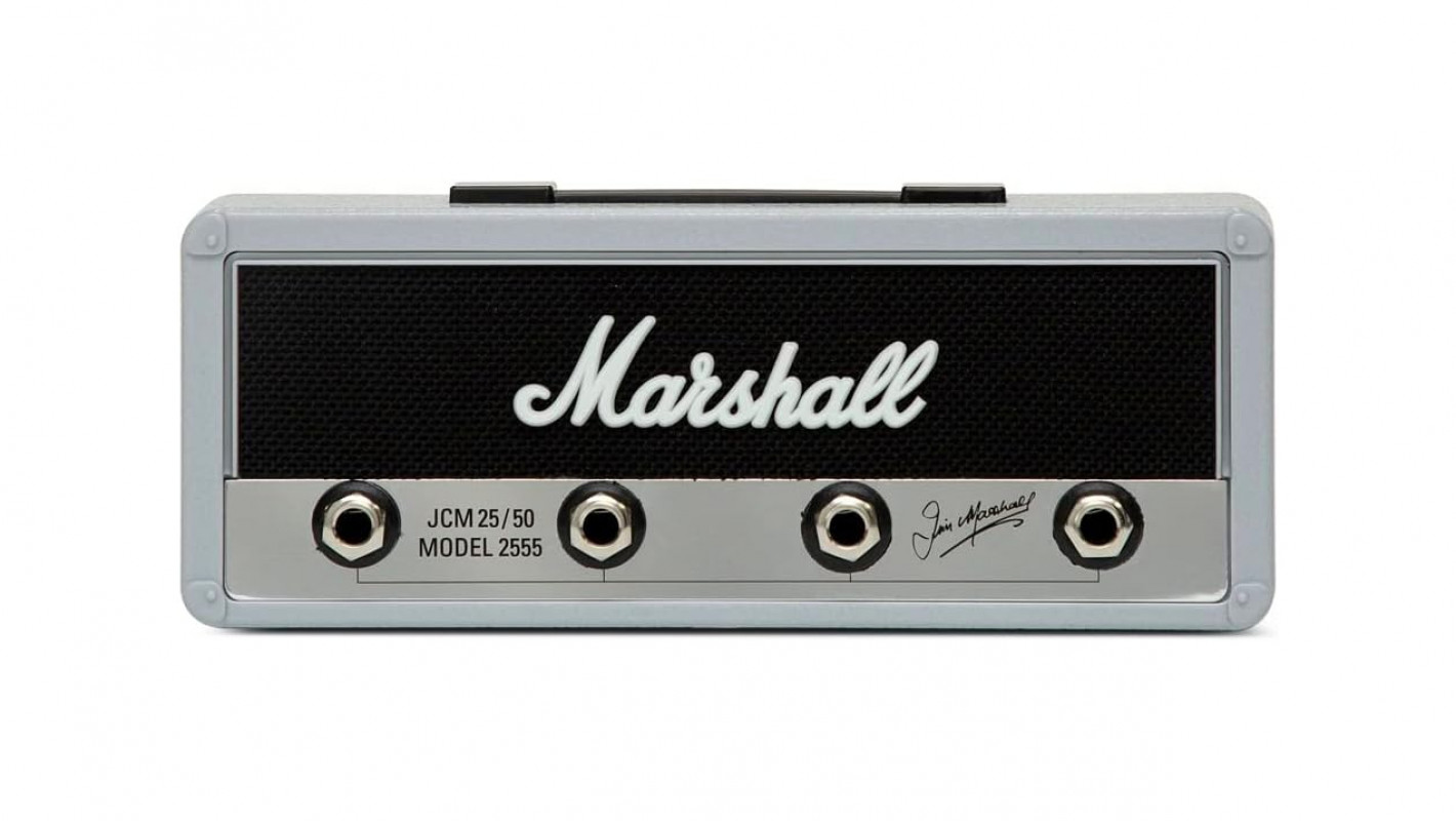 This wall-mounted key holder features an eye-catching design that replicates, in a scaled-down version, the look of a Marshall amplifier from the Silver Jubilee series, known for its silver finish and distinctive aesthetic.