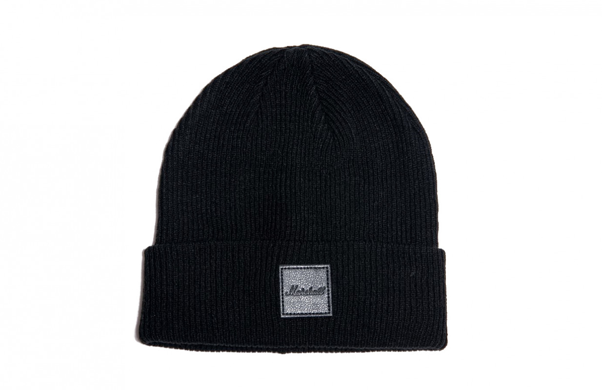 Marshall winter ski hat in black, made from soft cotton with an embossed logo on a square leather panel.