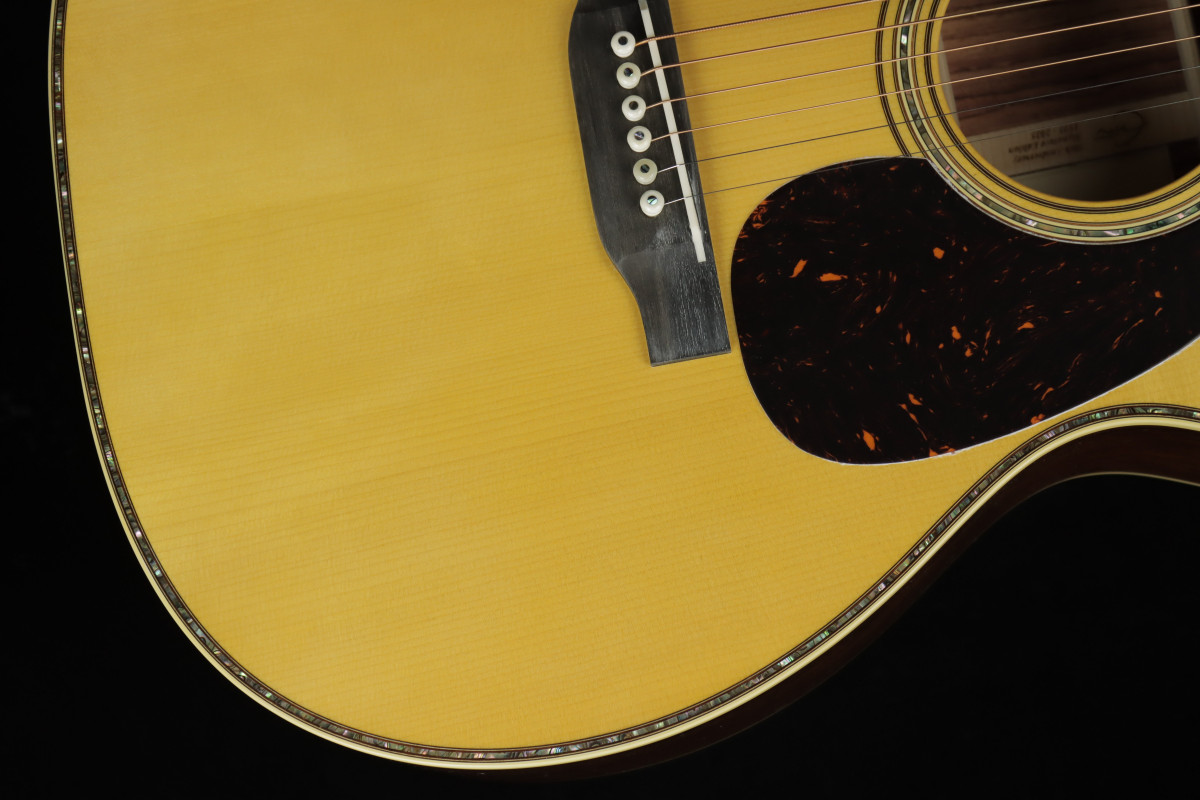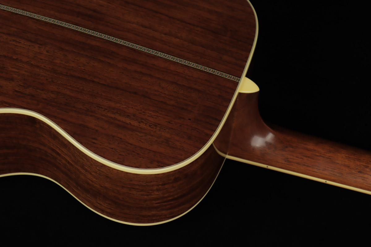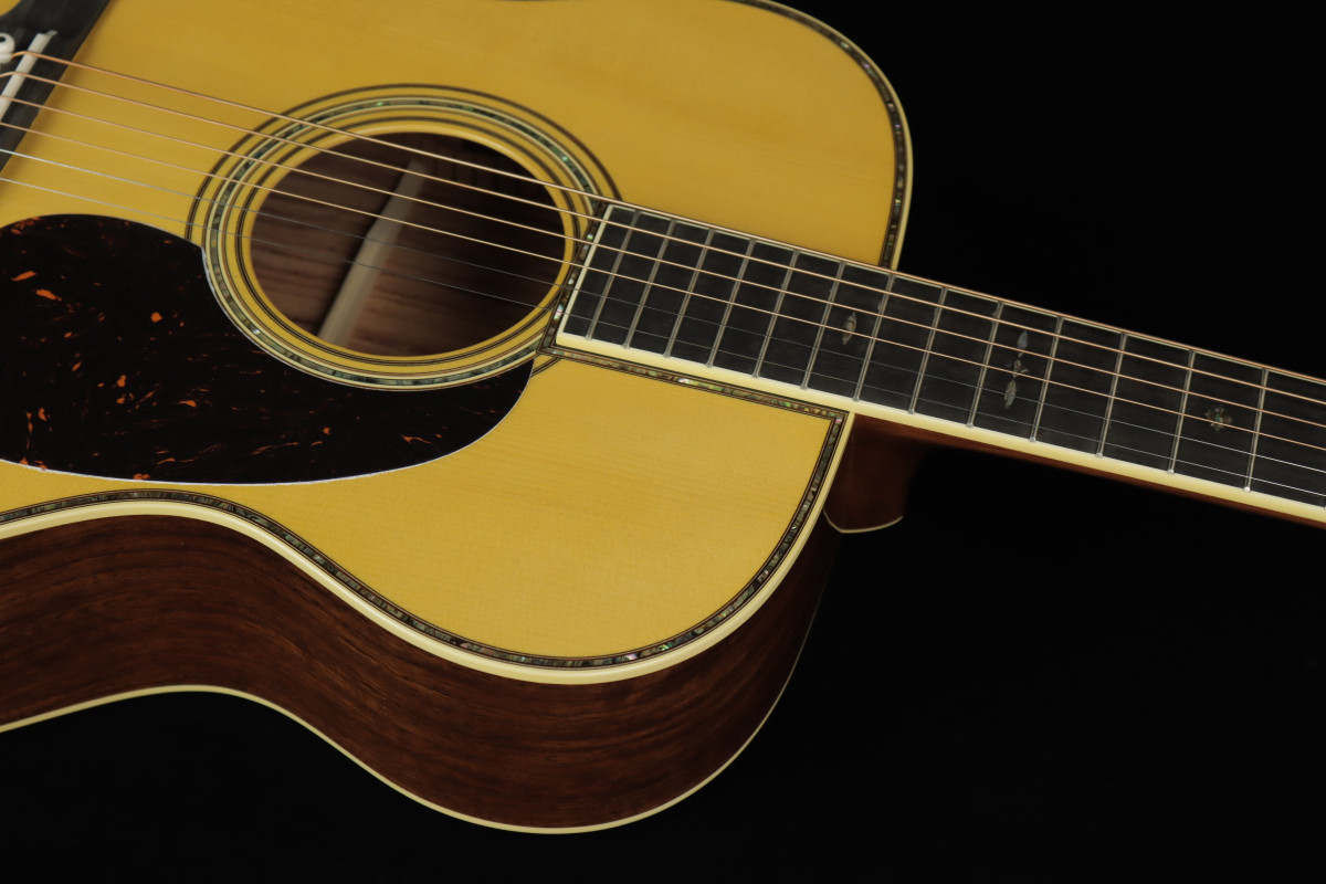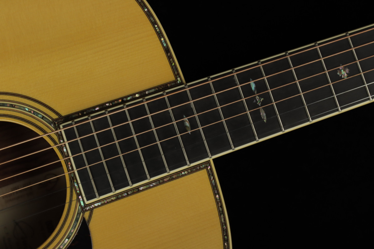 This combination delivers a warm, rich tonal depth, perfectly suited for both delicate fingerstyle playing and bold strumming. The scalloped Adirondack spruce Golden Era-inspired bracing enhances resonance and projection, ensuring this guitar fills any room with an unmistakably full-bodied sound. The genuine mahogany neck and Authentic 1939 shape, paired with a slightly thinner nut width and an ebony fingerboard adorned with Golden Era 42-style snowflake inlay, offer effortless playability and classic looks.