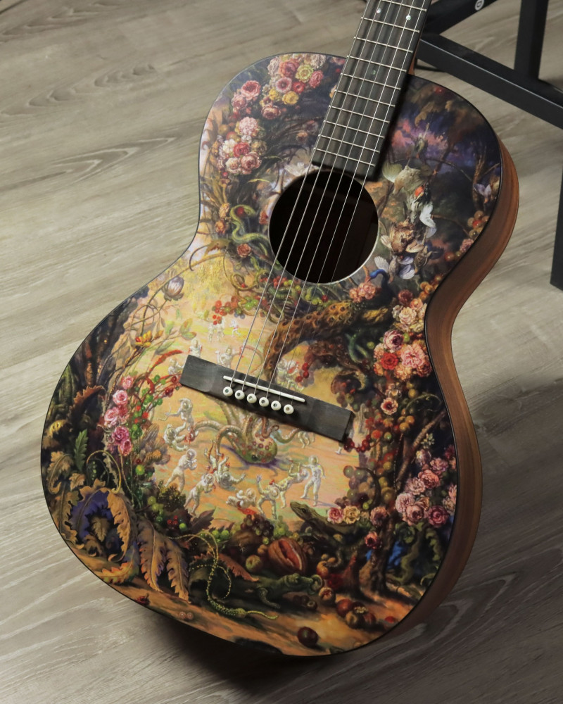 The guitar features Heffernan's captivating oil painting, "Self-Portrait as Arms and the Men," beautifully reproduced on the top made of certified FSC® solid spruce. This guitar is not just a musical instrument; it is a work of art that merges the worlds of art and music.