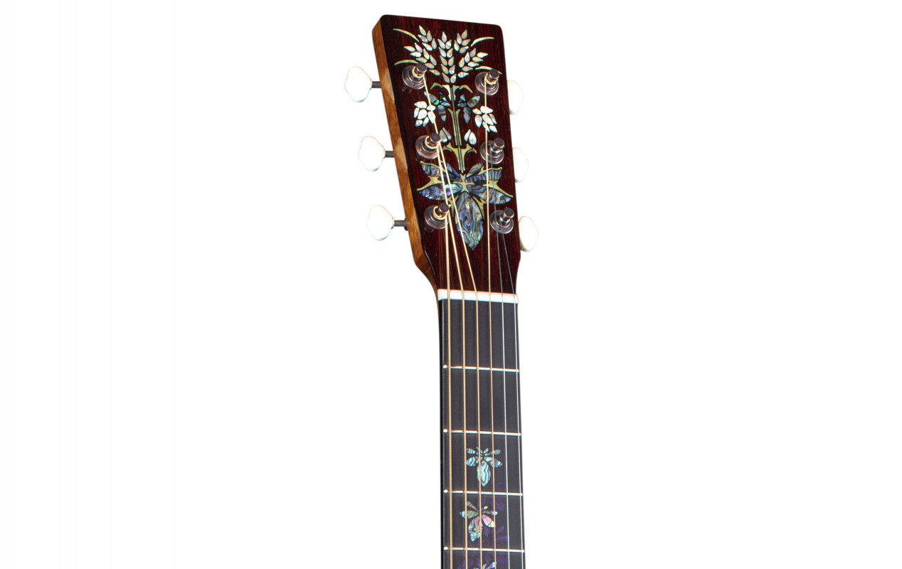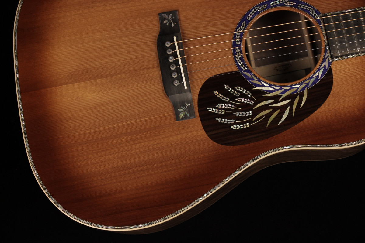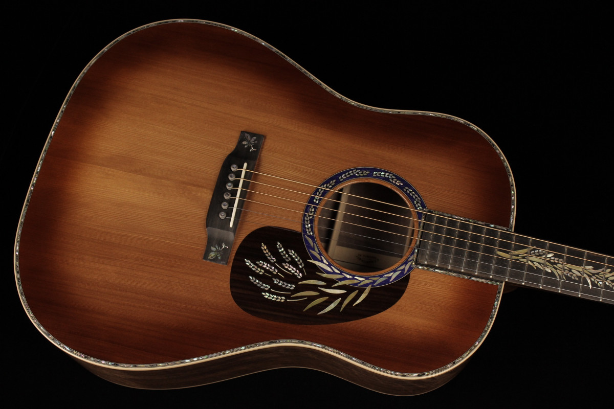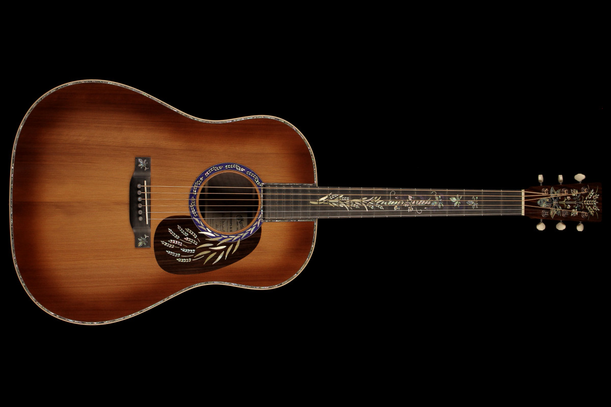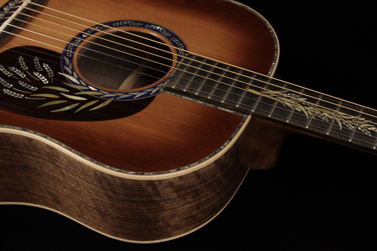 It produces a very balanced sound that mellows out over time to a nice warm tone. The top is made with sinker redwood and is complemented with European flamed maple and pearl inlay binding on the front and a Guatemalan rosewood headplate and pickguard. The headstock, fingerboard, rosette, pickguard, and bridge are adorned with a combination of abalone, mother-of-pearl, and wood inlay, which depict hops and barley in various forms.