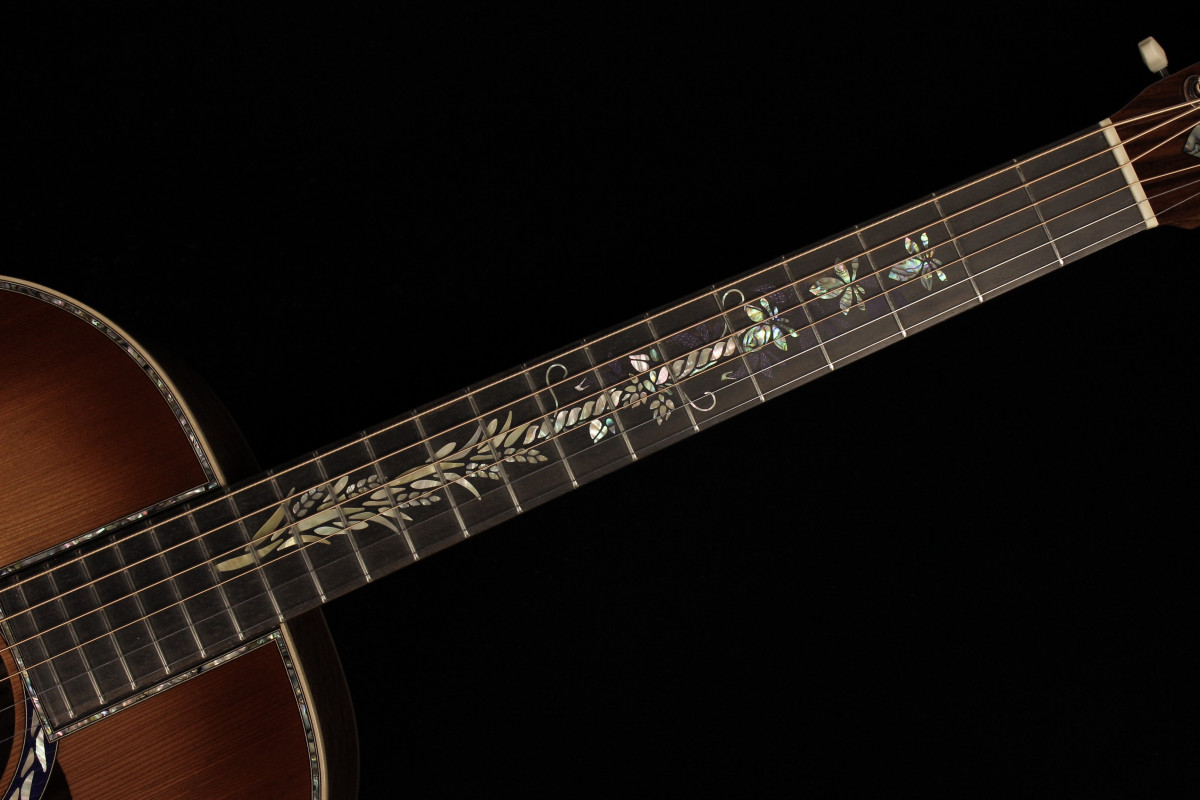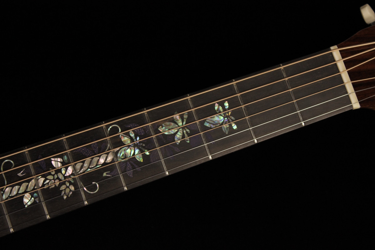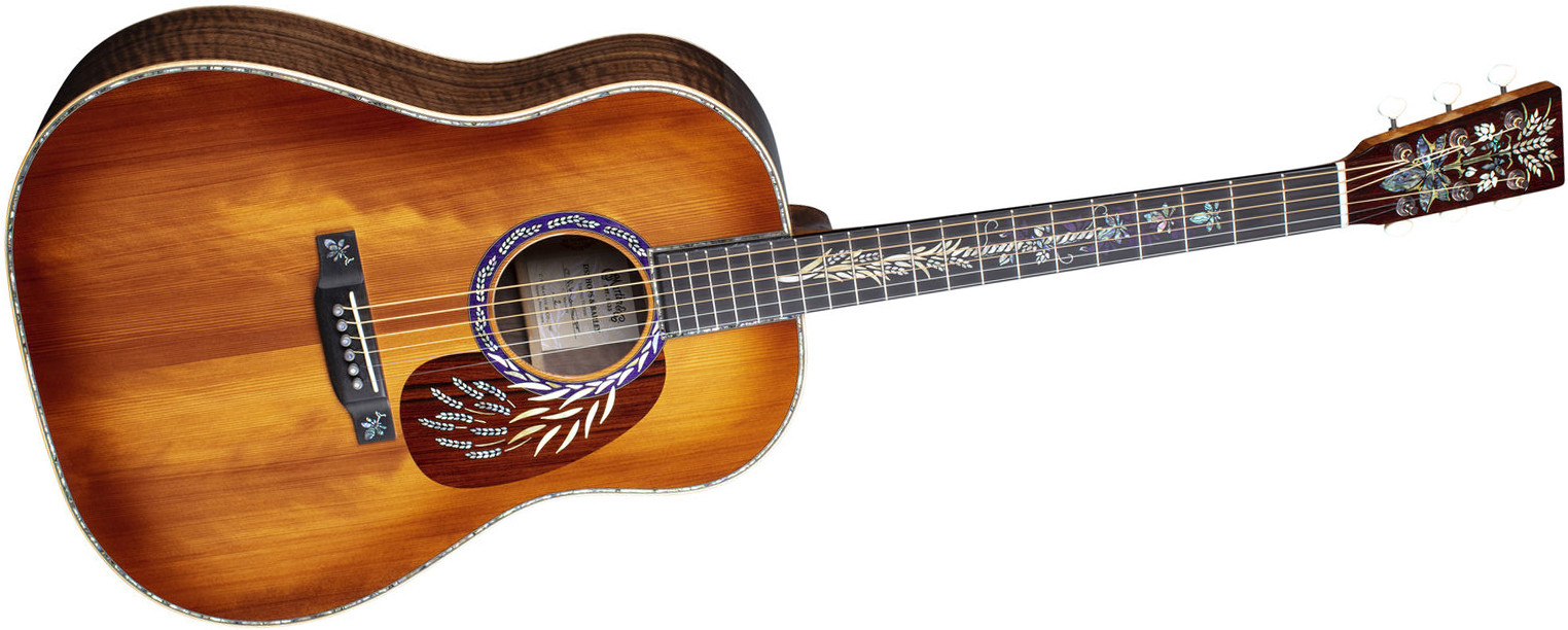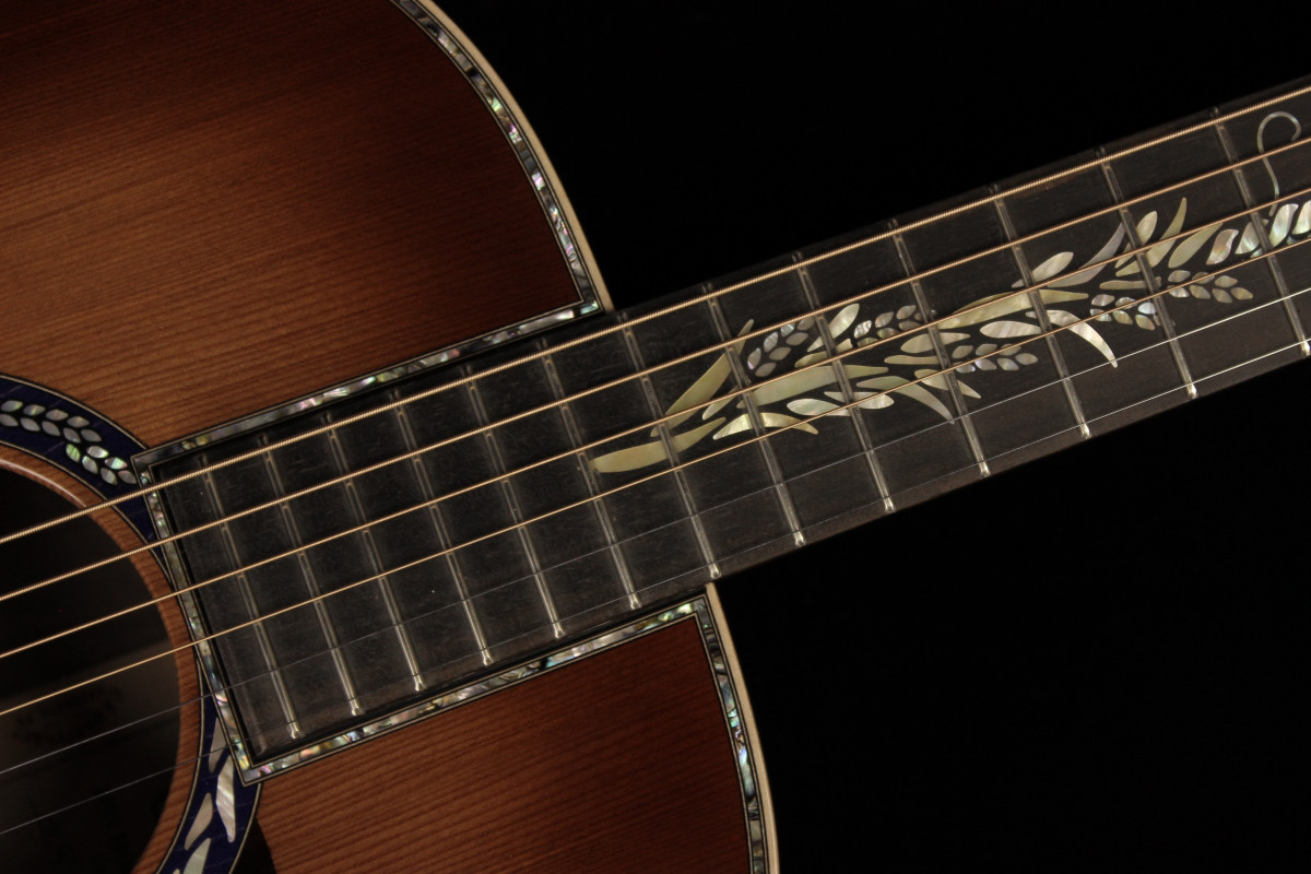 It produces a very balanced sound that mellows out over time to a nice warm tone. The top is made with sinker redwood and is complemented with European flamed maple and pearl inlay binding on the front and a Guatemalan rosewood headplate and pickguard. The headstock, fingerboard, rosette, pickguard, and bridge are adorned with a combination of abalone, mother-of-pearl, and wood inlay, which depict hops and barley in various forms.