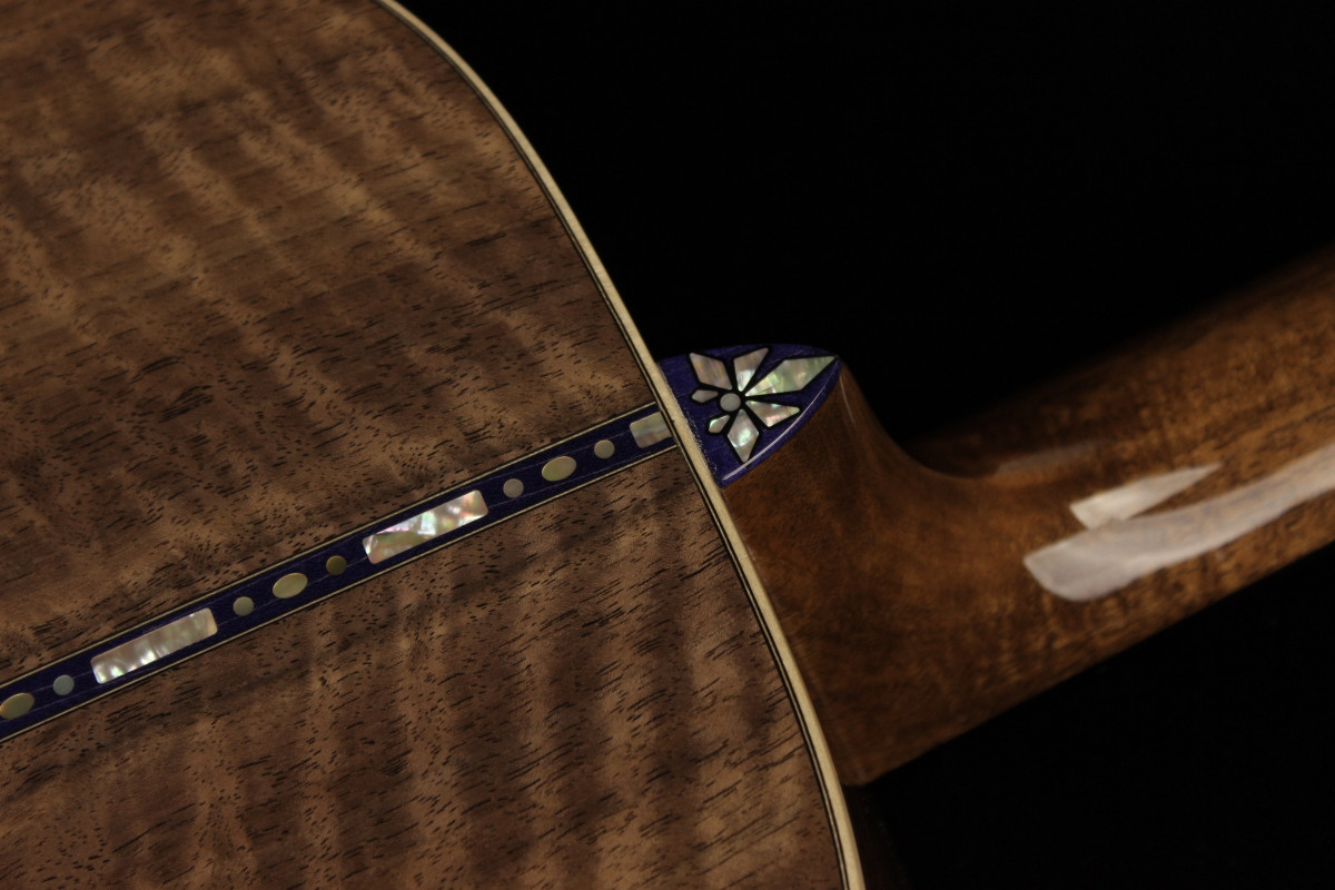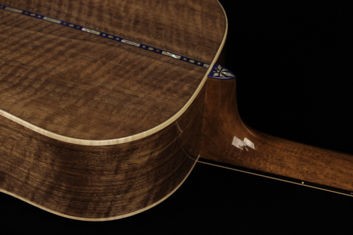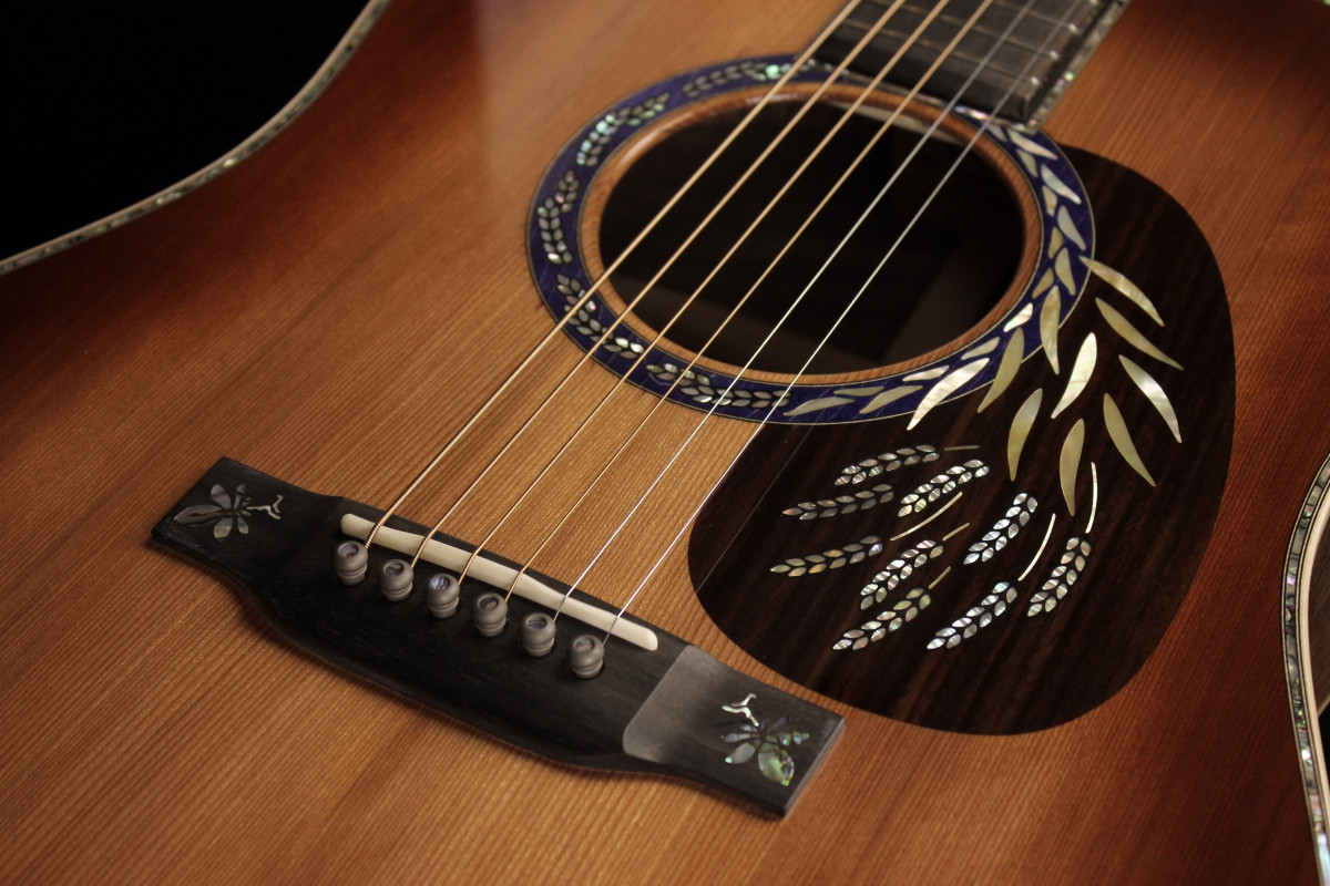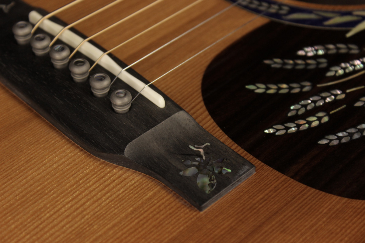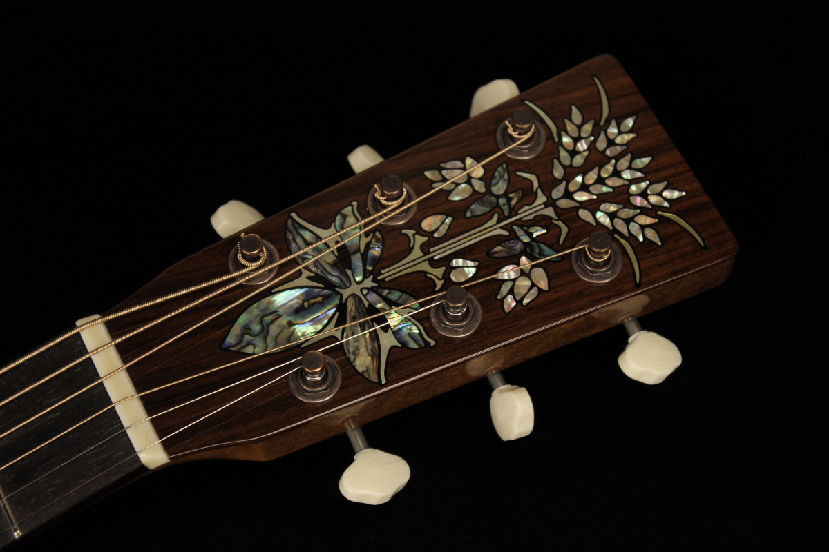 It produces a very balanced sound that mellows out over time to a nice warm tone. The top is made with sinker redwood and is complemented with European flamed maple and pearl inlay binding on the front and a Guatemalan rosewood headplate and pickguard. The headstock, fingerboard, rosette, pickguard, and bridge are adorned with a combination of abalone, mother-of-pearl, and wood inlay, which depict hops and barley in various forms.
