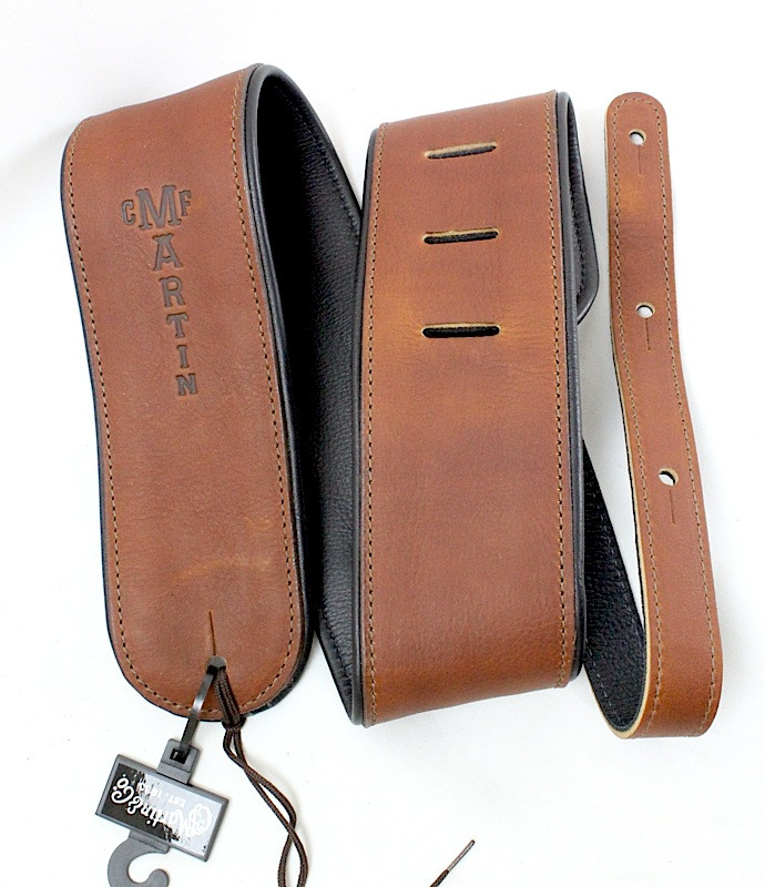 Leather strap in tan color with the Martin logo branded, edged and lined with soft black leather, finished with quilting. Height: 7.5 cm. Maximum length: 135 cm.