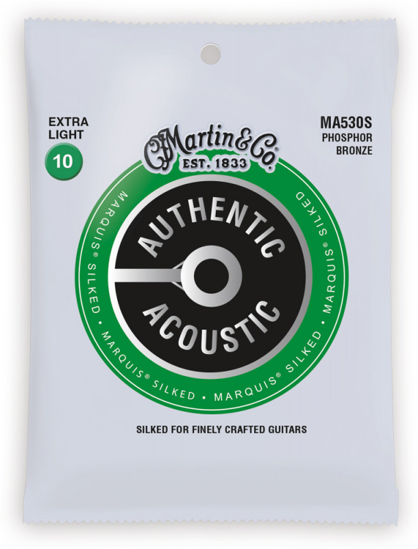 The MA530S acoustic guitar strings by Martin & Co from the Authentic Acoustic Marquis Silked series feature a soft silk wrapping at the ball end, providing extra protection to minimize wear on the bridge.