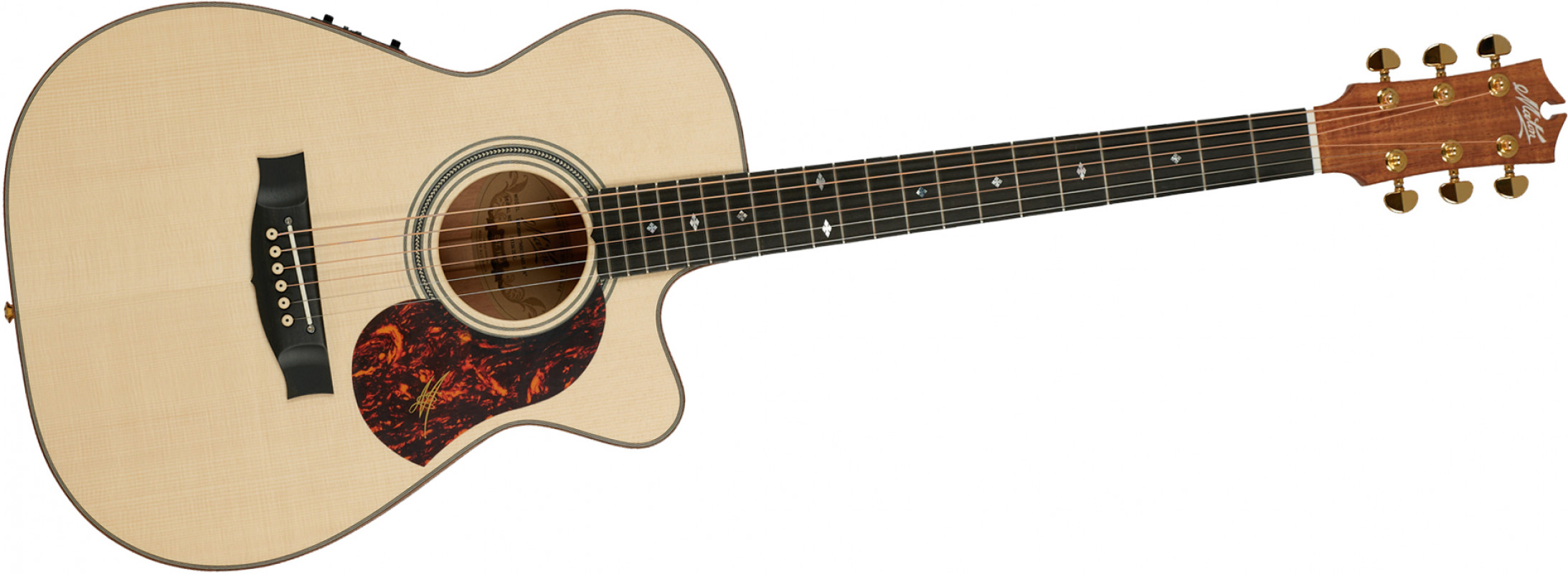 The combination of a “AAA” Sitka Spruce soundboard, Ebony fingerboard and bridge and solid Queensland Maple back, sides and neck produces a tone that is rich, full, well balanced and with the glassy highs essential to Michael’s tone.