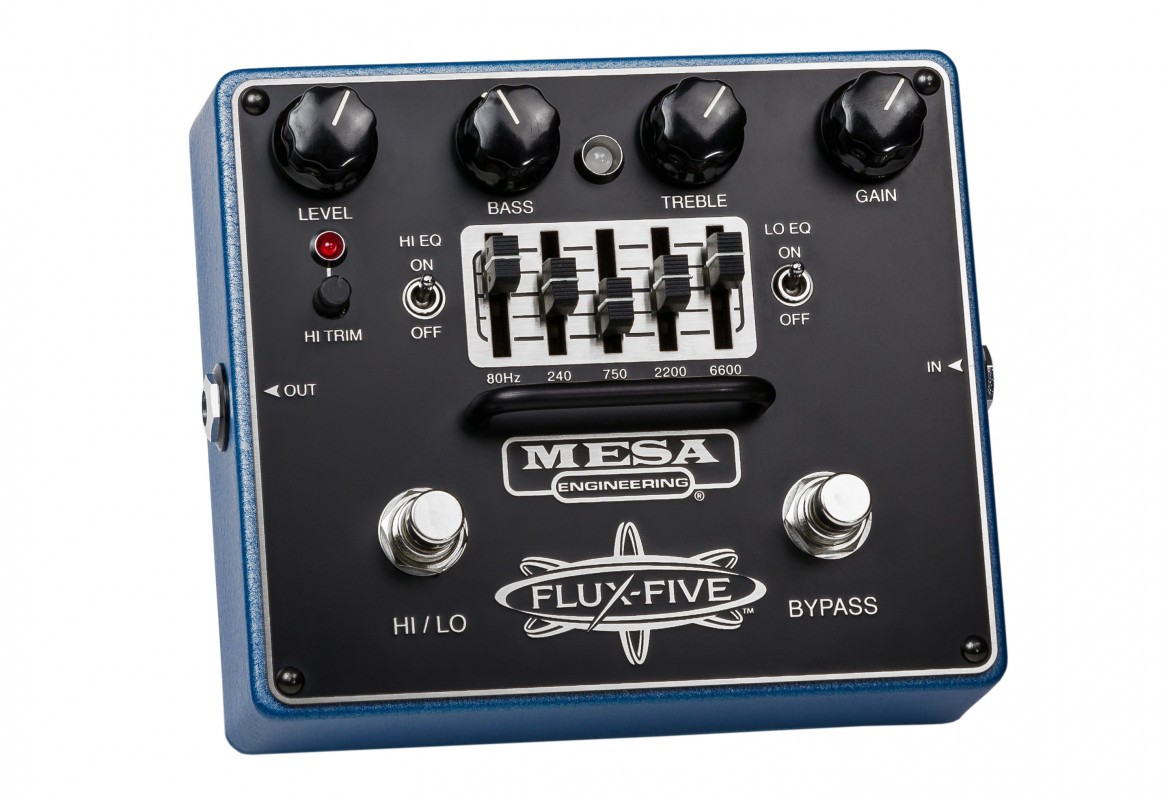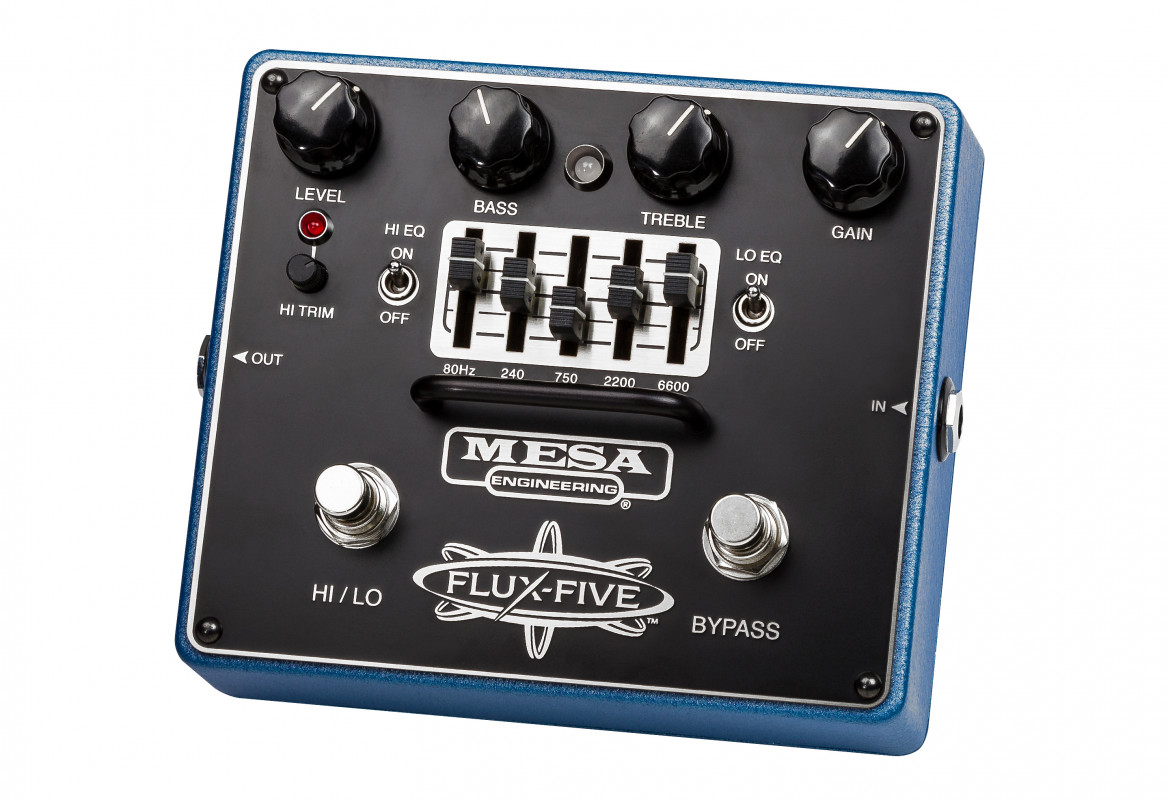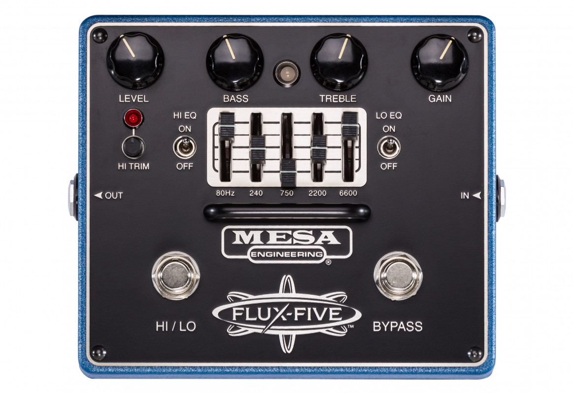 The Flux-Five adds Mesa Boogie's classic five-band graphic EQ and switchable HI/LO modes via footswitch, with separate OUTPUT LEVEL controls, to the already versatile package offered by the Flux-Drive, providing greater sound-shaping power and enhanced stylistic versatility.