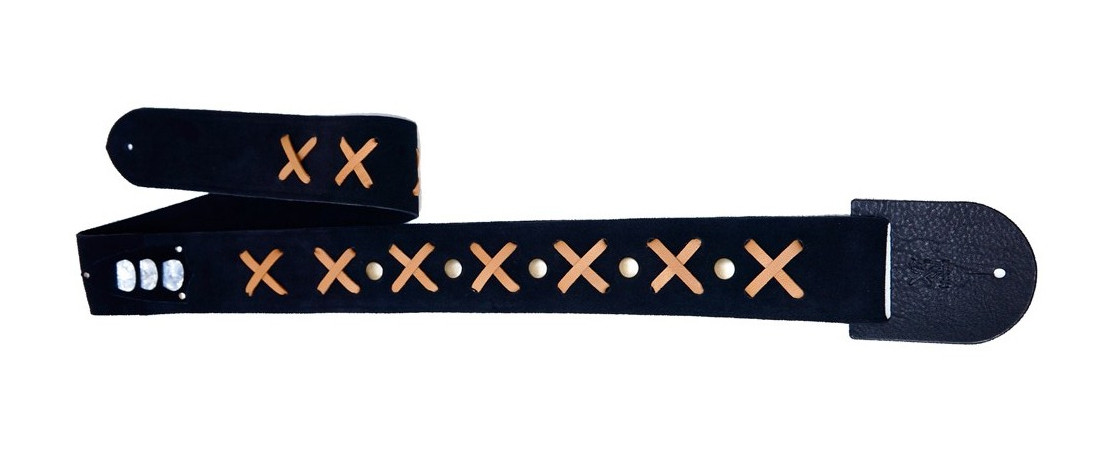 The Jimmy The Legend Strap is made from soft suede on both sides, featuring a design of intertwined leather laces. It is a replica of the strap used by Jimi Hendrix at his last concert at the Isle of Wight in September 1970, finished in black. The strap was later sold at an auction and purchased by David Gilmour.