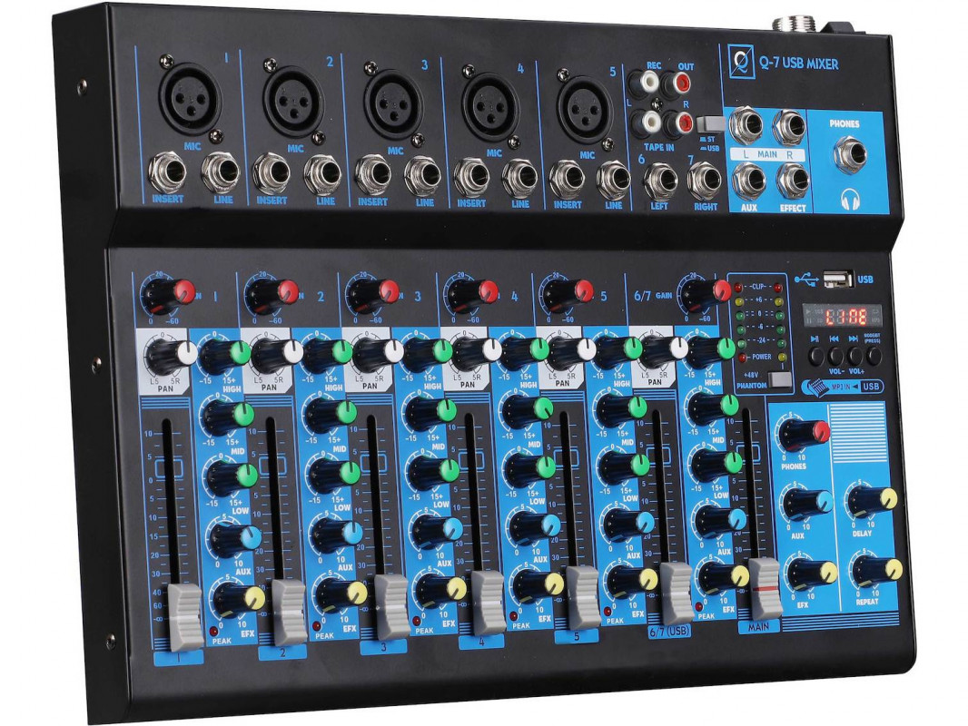 7-channel mixer with USB/Bluetooth MP3 player (5 Mono channels + 1 Stereo), 5 XLR microphone inputs, 2 Line inputs, high-quality microphone preamps, Gain and Pan control for each channel, 3-band active equalization for each channel, Aux and effects send on each channel, 48V Phantom Power for condenser microphones, headphone output with separate volume control, 2 Stereo Output ¼" jacks, Aux In and Out RCA, power supply included.