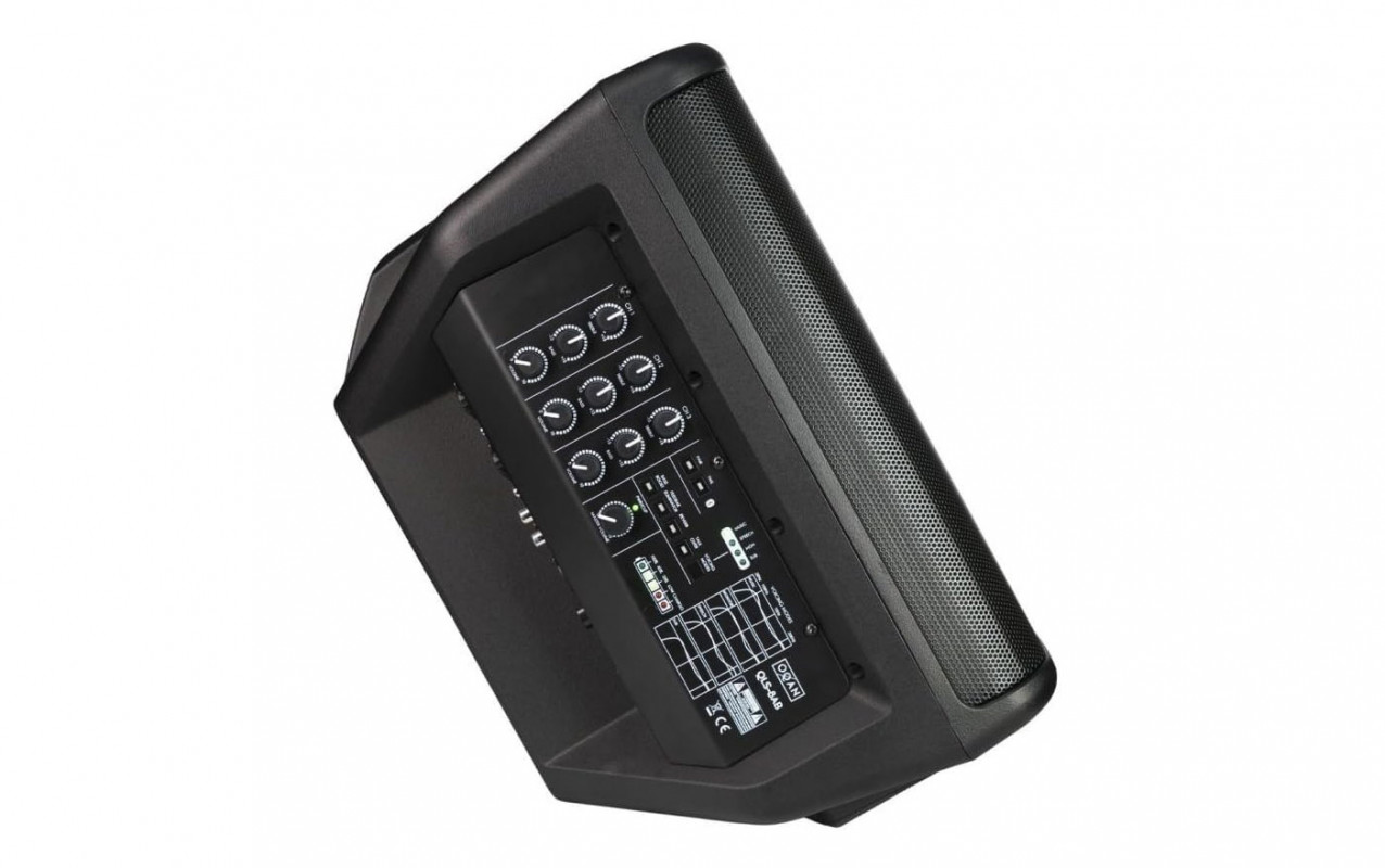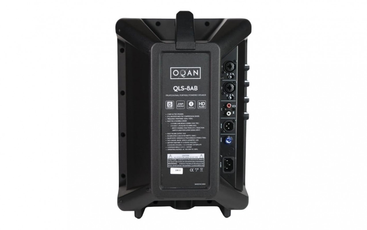 The OQAN QLS 8AB is a portable powered speaker designed to offer versatility and practicality in various usage scenarios, such as small events, presentations, musical activities, or outdoor use. It integrates a rechargeable lithium-ion battery with a runtime of up to approximately 4 hours, allowing for use even in the absence of direct power supply.