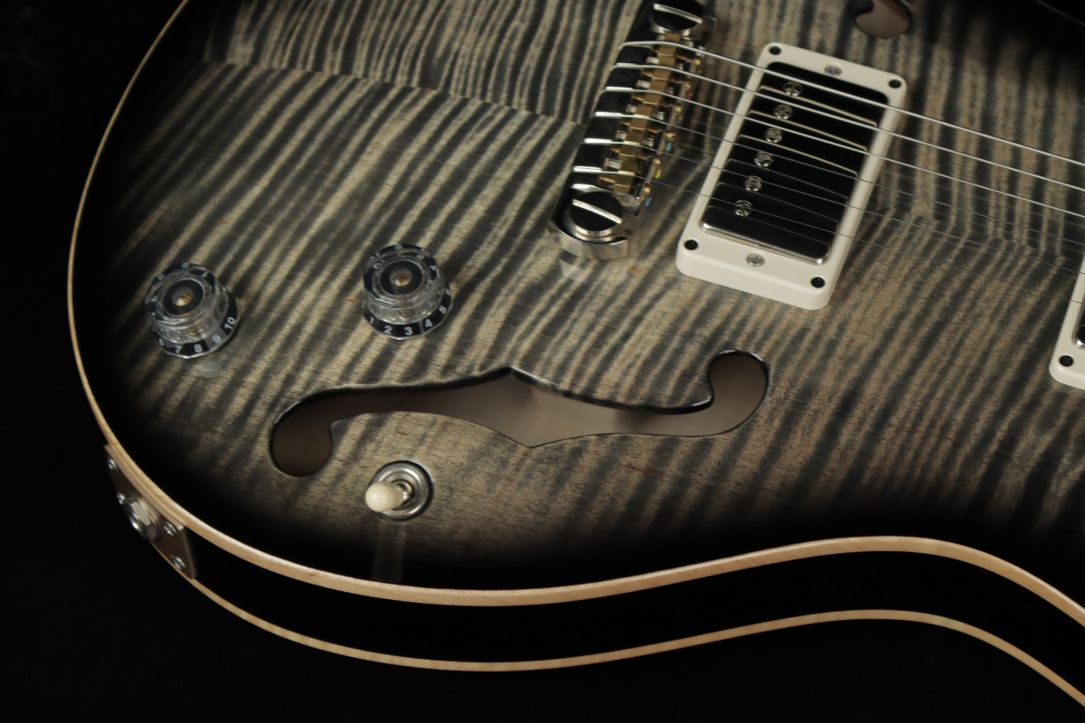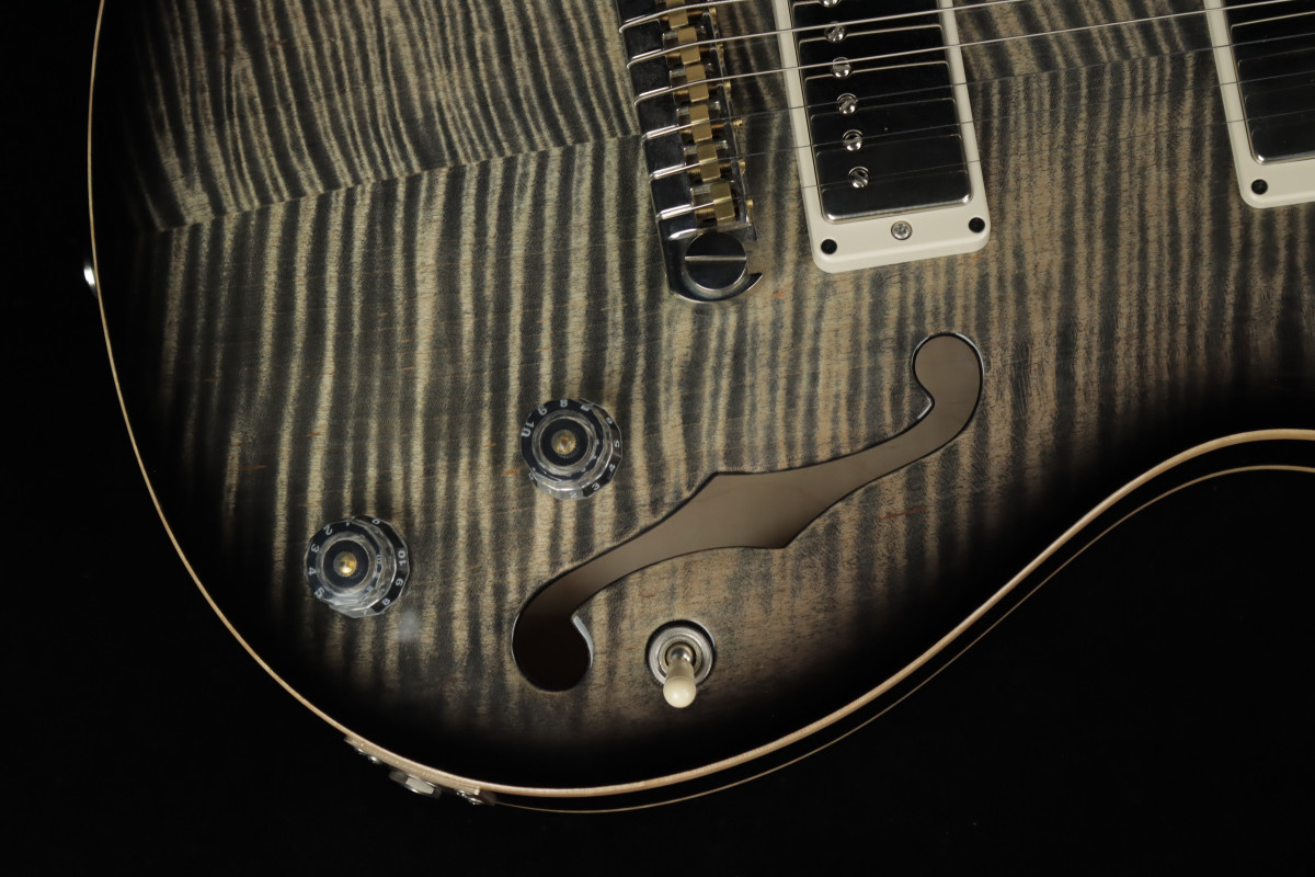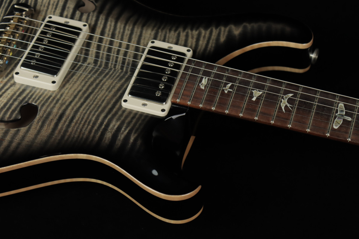 The Paul Reed Smith Hollowbody II features a solid flamed maple back and top, along with solid mahogany sides, showcasing a fully hollow body construction.