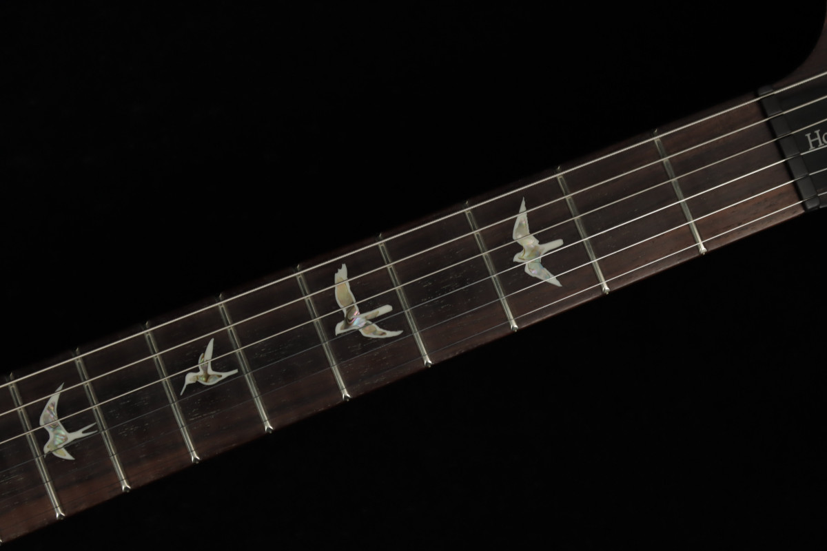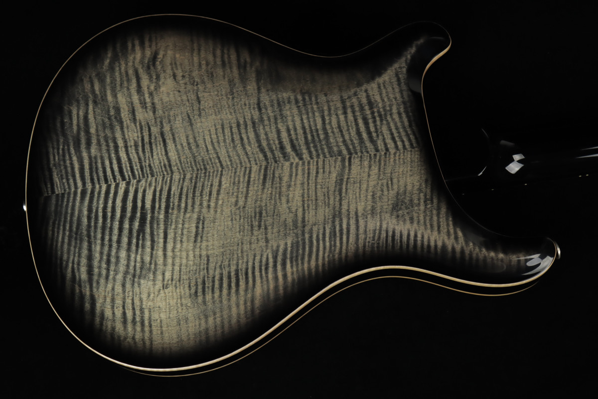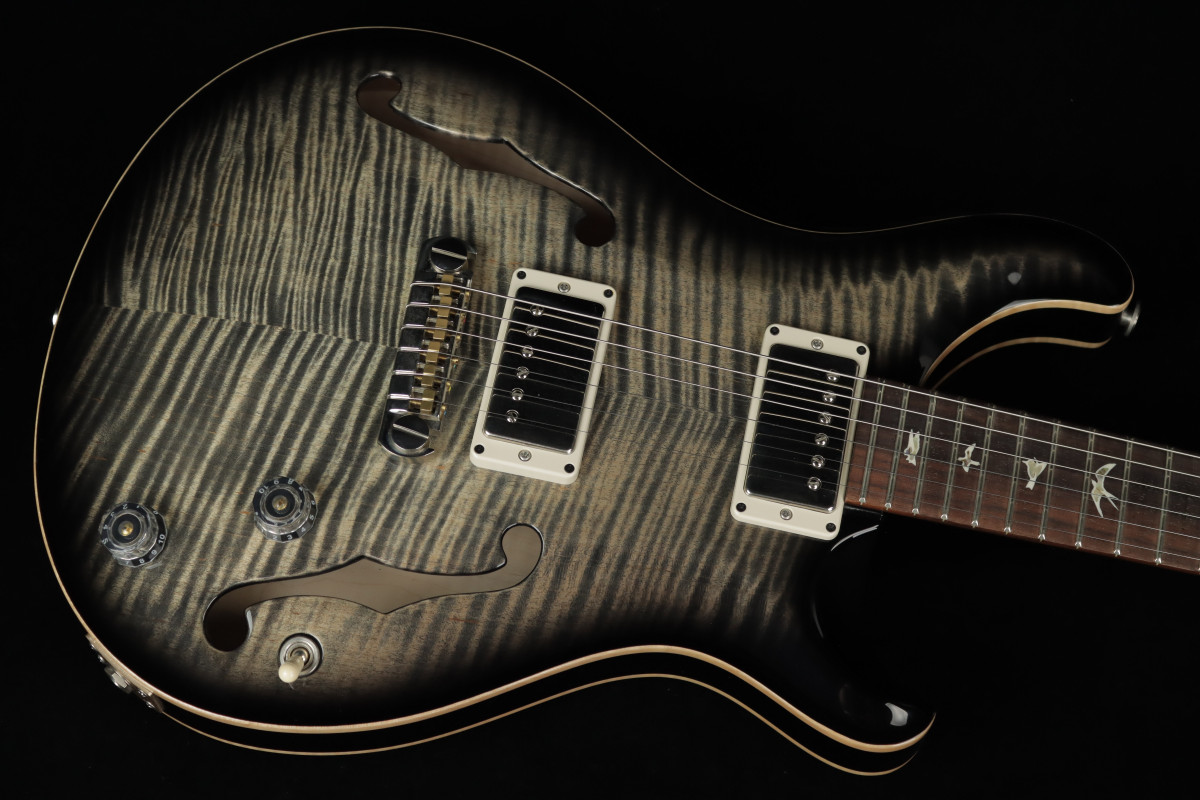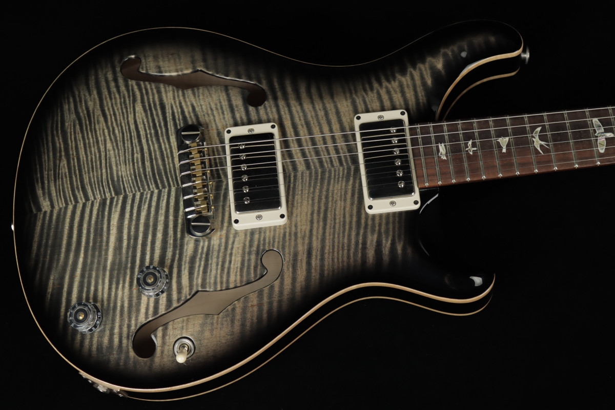 The Paul Reed Smith Hollowbody II features a solid flamed maple back and top, along with solid mahogany sides, showcasing a fully hollow body construction.