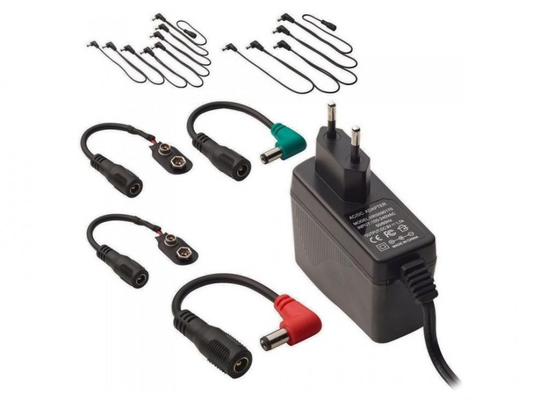 9V DC power supply, 1700 mA, with a 2.1 x 5.5 mm connector, capable of powering up to 8 effects. Connection cable length: 1 m. Included in the price are: 1x Daisy Chain Cable with 8 outputs, 2x 3.5 mm mini jack adapters, 2x 9V Battery Clip Adapters, and 1x adapter for connecting Line 6 pedals.