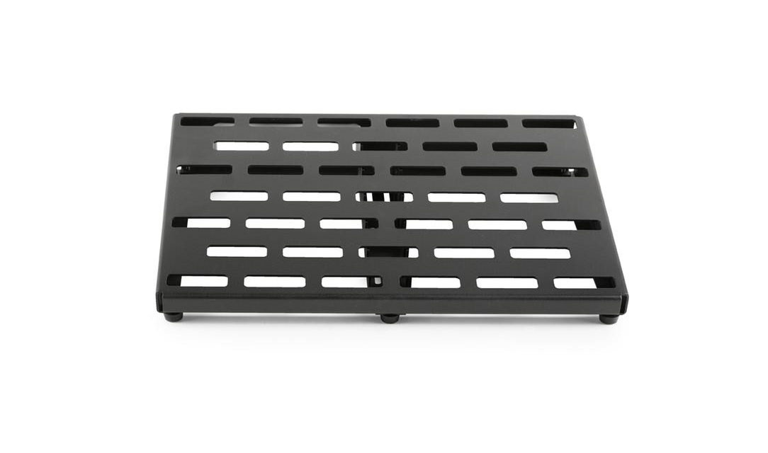 Its ingenious design is based on a perforated aluminum plate: this allows for a larger flat surface compared to traditional "rail" pedalboards.