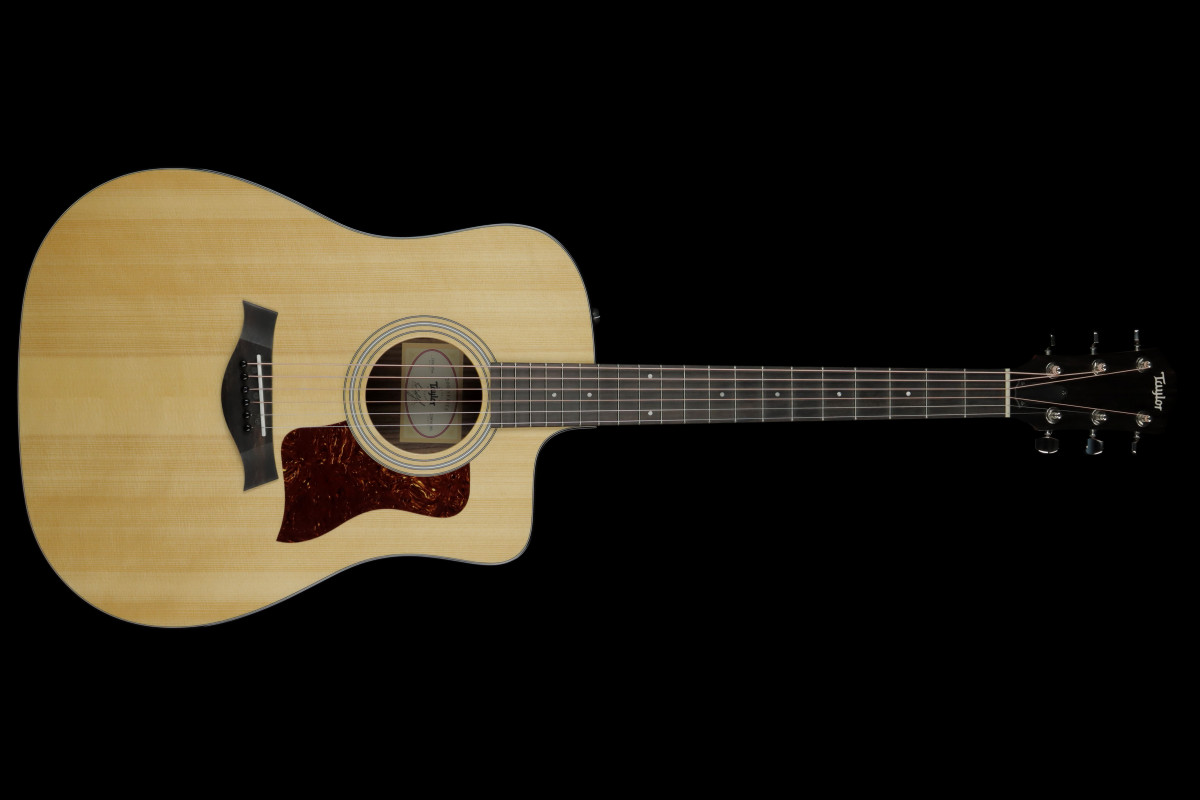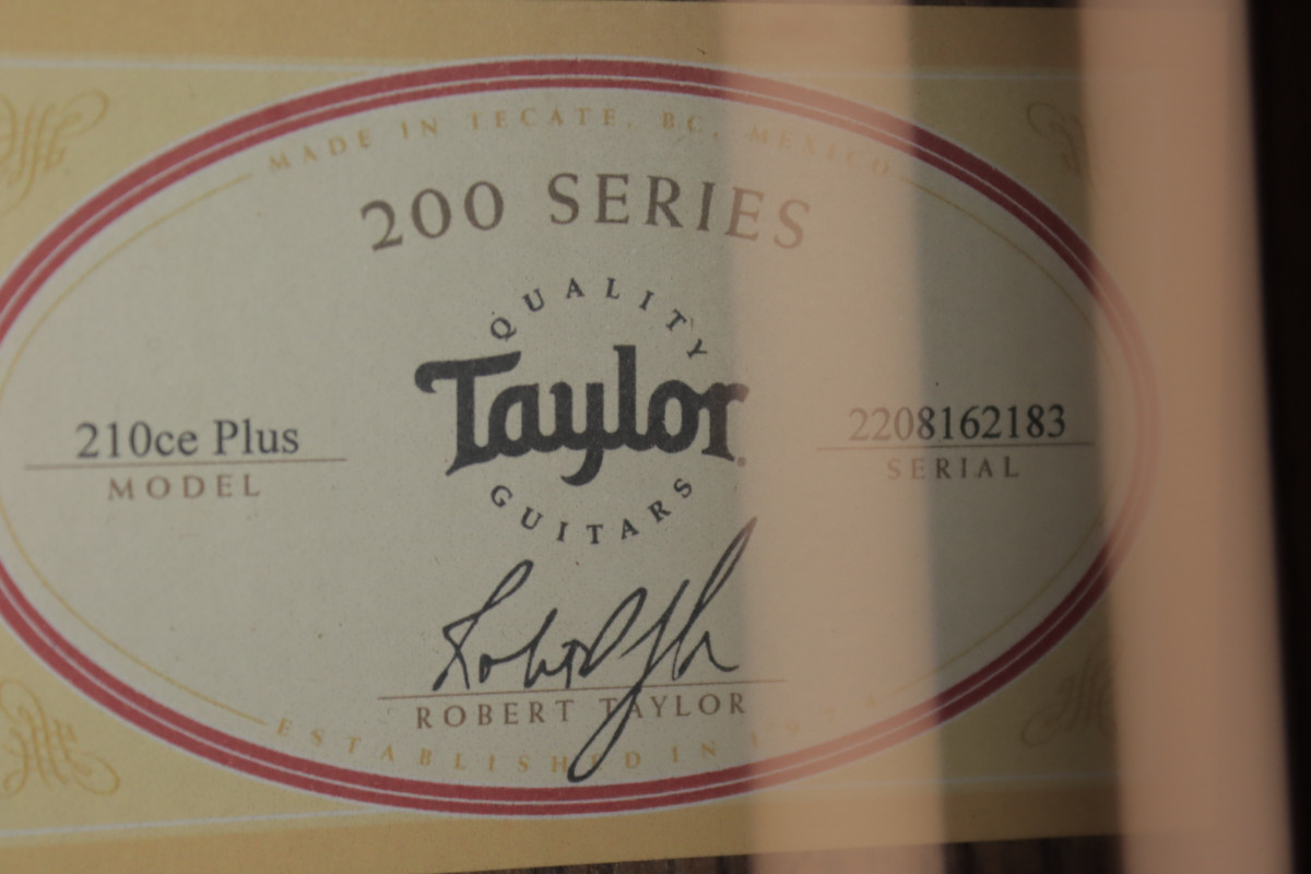 Unlike the standard version, this Plus variant of the 210ce is characterized by a completely glossy finish, black binding, 4mm dot inlays, and comes with a Taylor Aerocase™.