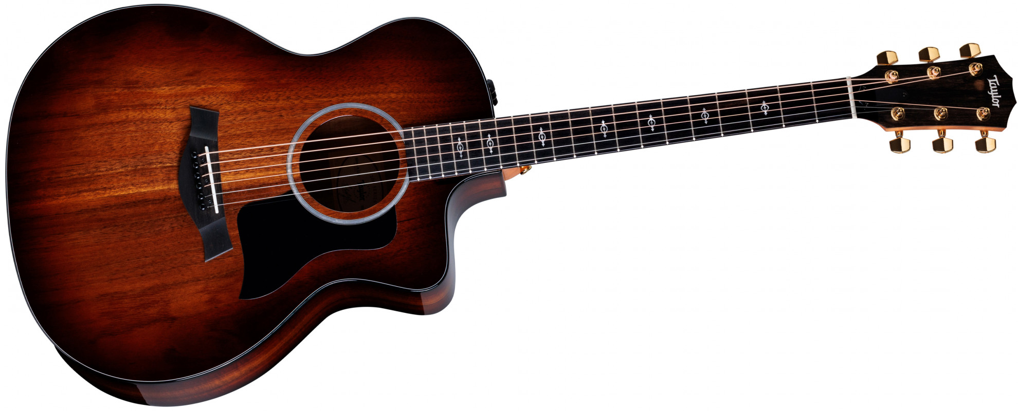 The Taylor 224ce-K is an electro-acoustic guitar belonging to the 200 Series. It features a Grand Auditorium body shape, which produces a more balanced sound across various frequencies. The materials used include layered koa for the back and sides, stunning solid koa for the top, and ebony for the fingerboard and bridge.
