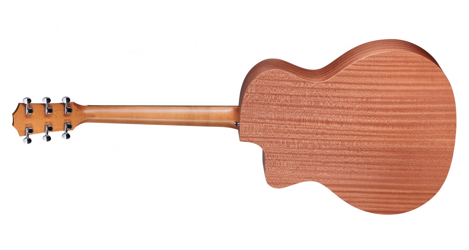 The back and sides are made of laminated African sapele, paired with a solid mahogany top, producing a warm and mellow tone.