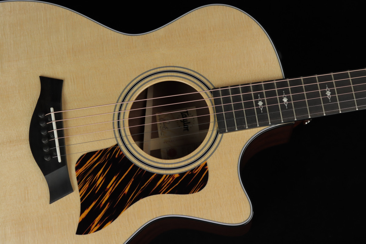 Black binding flanks sapele’s ribbon-like grain, with small diamond fretboard inlays in Italian acrylic adding a traditional touch. The guitar incorporates a Venetian cutaway, comes equipped with Taylor’s Expression System 2 pickup, and ships in a Taylor deluxe hardshell case.