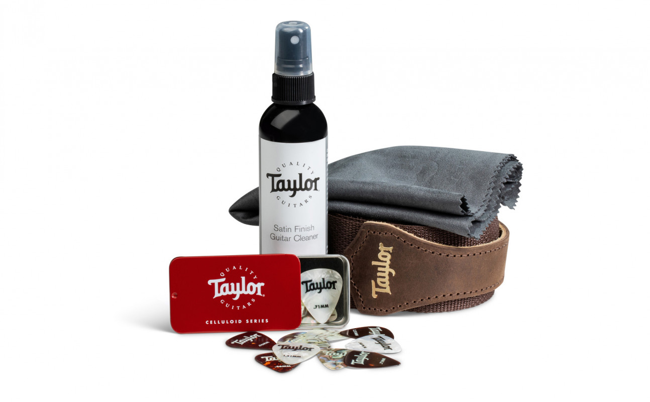 Included in the pack are a bottle of Taylor Satin Finish spray, a microfiber cloth, an adjustable-length strap, a pick case with several Taylor picks.