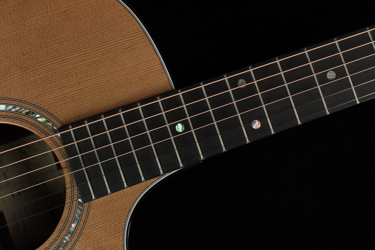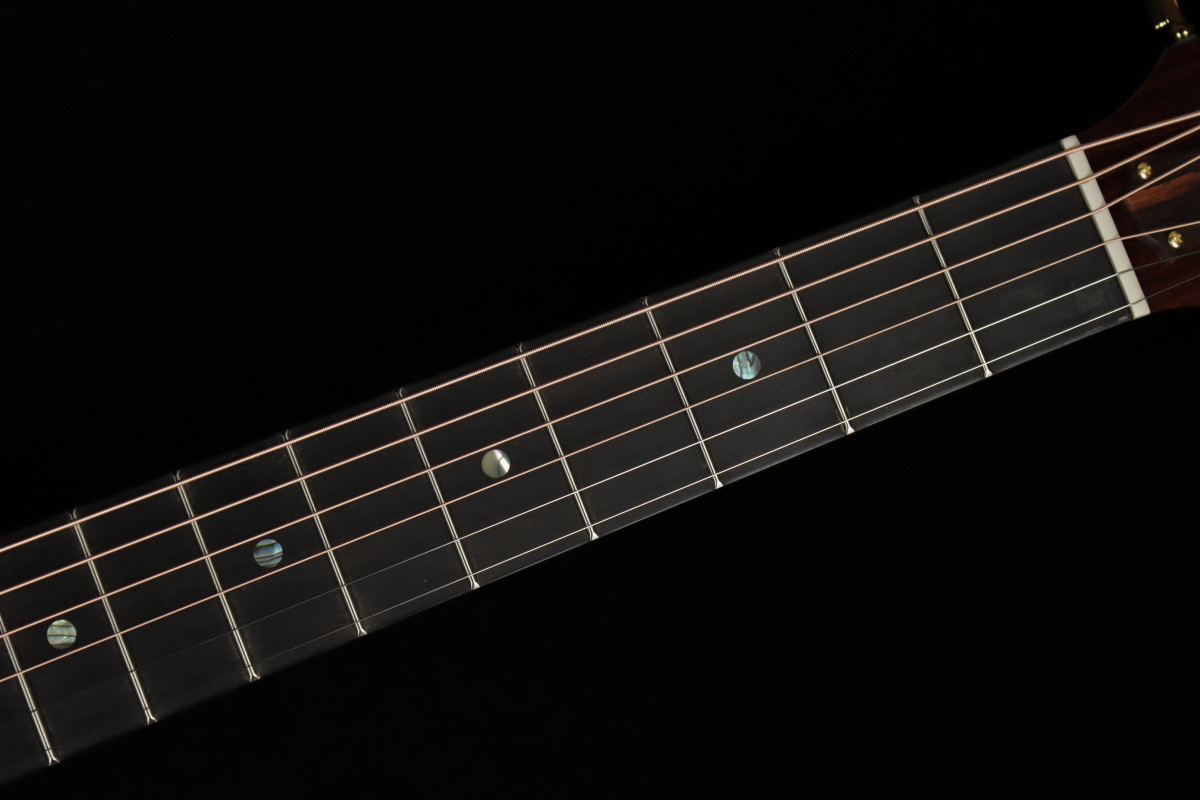The result is an exceptionally warm, mellow response with remarkable touch sensitivity that doesn't lose clarity in the treble range. Visually, this model reflects the understated aesthetic Bob preferred for his guitars of three decades ago, with appointments including black binding with black and white pinstripes, dot fretboard inlays in green abalone with a matching three-ring rosette, ebony bridge pins with green abalone dots, a faux-tortoiseshell pickguard, gold tuning machines, and a gloss-finished body paired with a satin-finished neck.