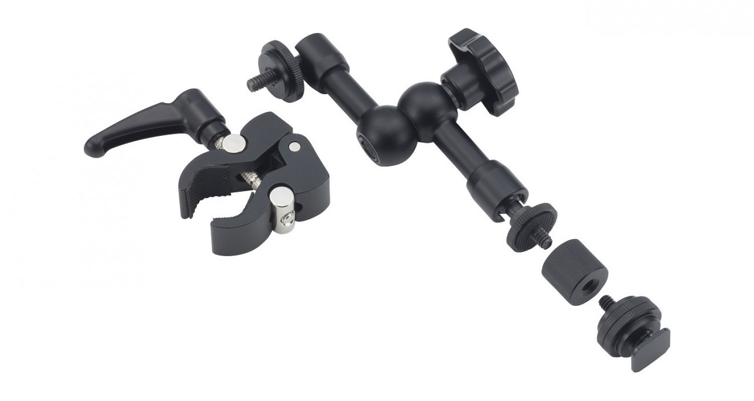 The HRM-7 is an aluminum alloy support that easily attaches to the Zoom Handy Recorder at one end and features a universal clamp on the other, providing adjustable accessories for recording setups.
