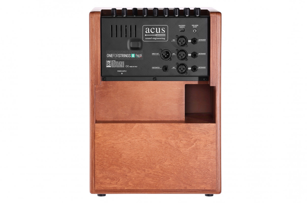 L'Acus One ForStrings 8 Ferdi è un amplificatore per chitarra acustica e classica da 150 Watt dotato di 3 ingressi separati, oltre ad un ingresso Aux (TRRS audio in/out e Bluetooth audio) provvisto di volume indipendente e equalizzatore a 2 bande.